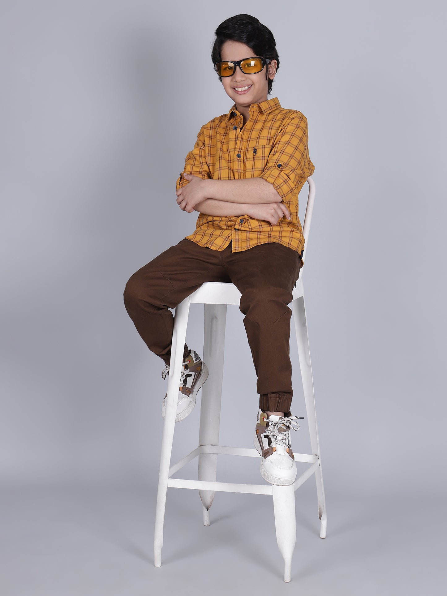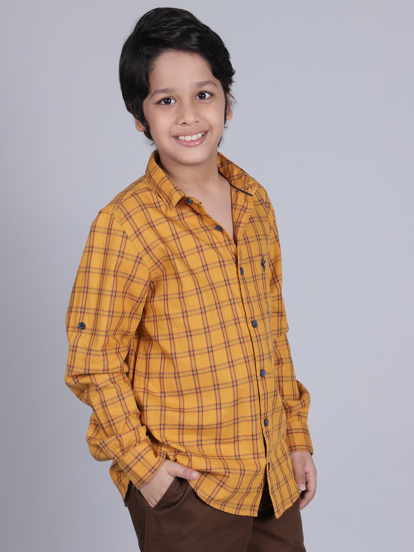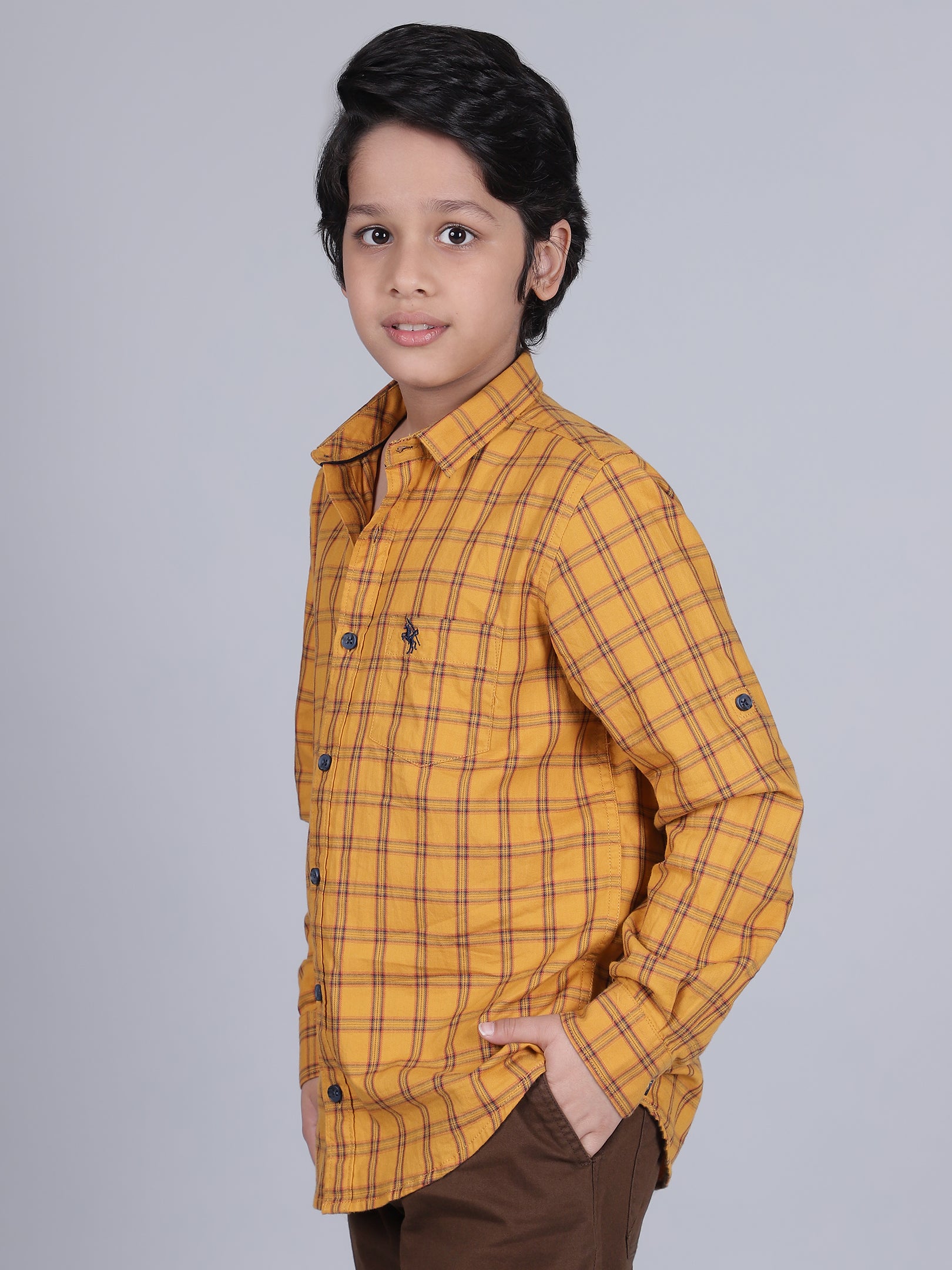 Boys Checkered Mustard Full Sleeves Spread Collar Casual Shirt