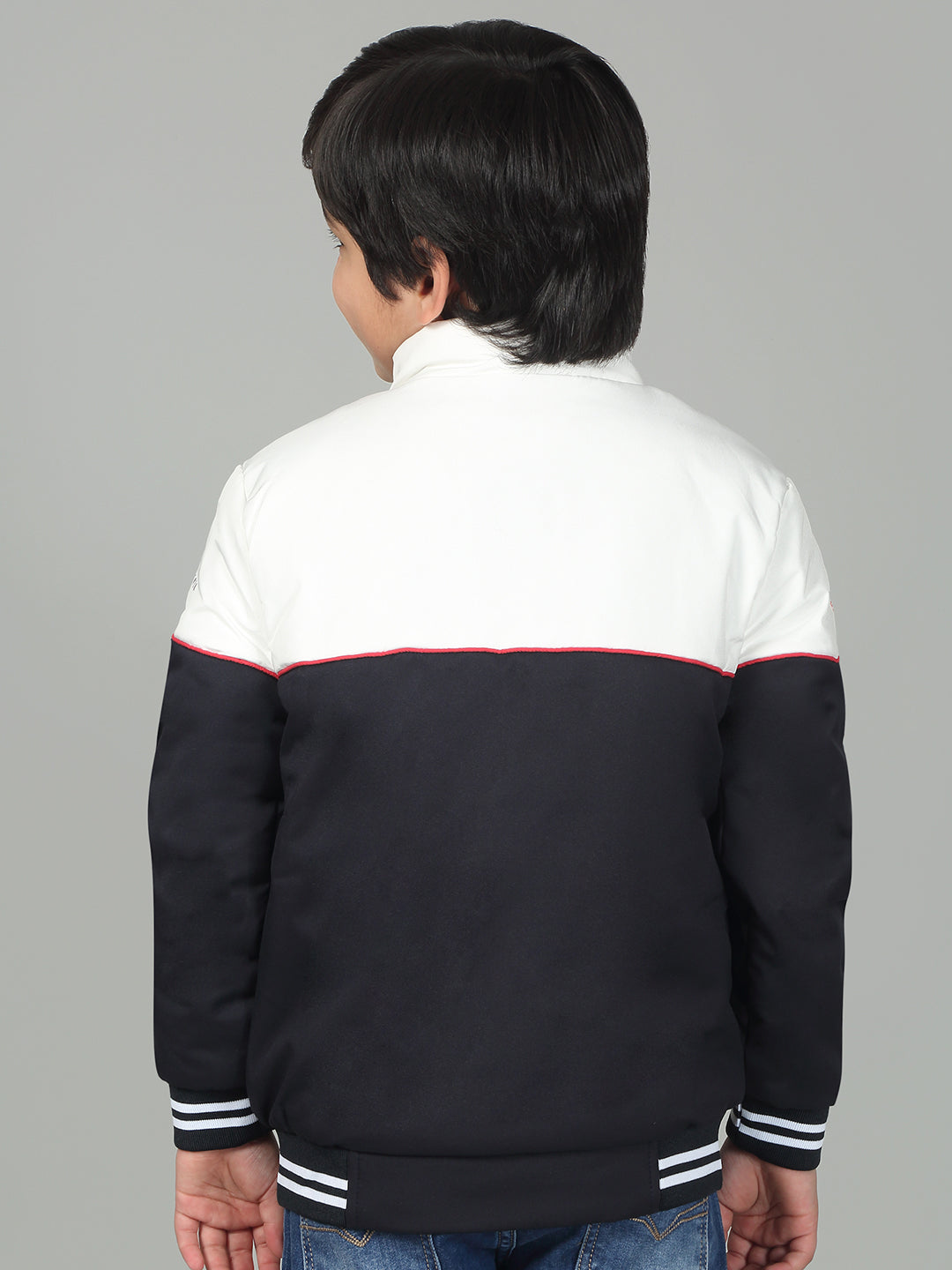 Boys Navy Blue Mock Neck Color Block Full Sleeves Casual Jacket
