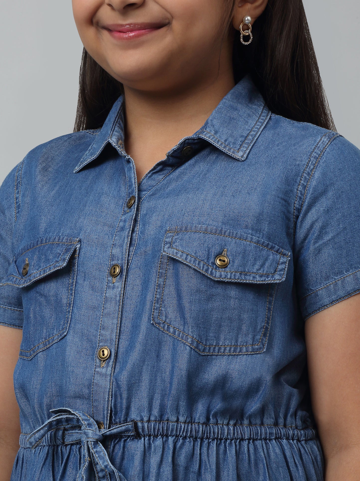 Girls Cotton Solid Shirt Collar Short Sleeves Fit and Indigo Blue Casual Dress