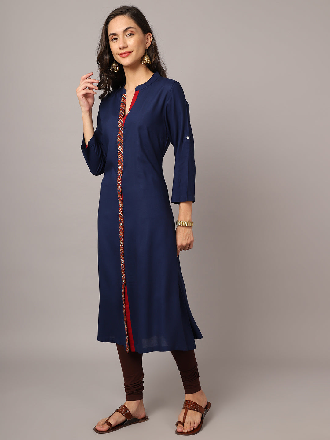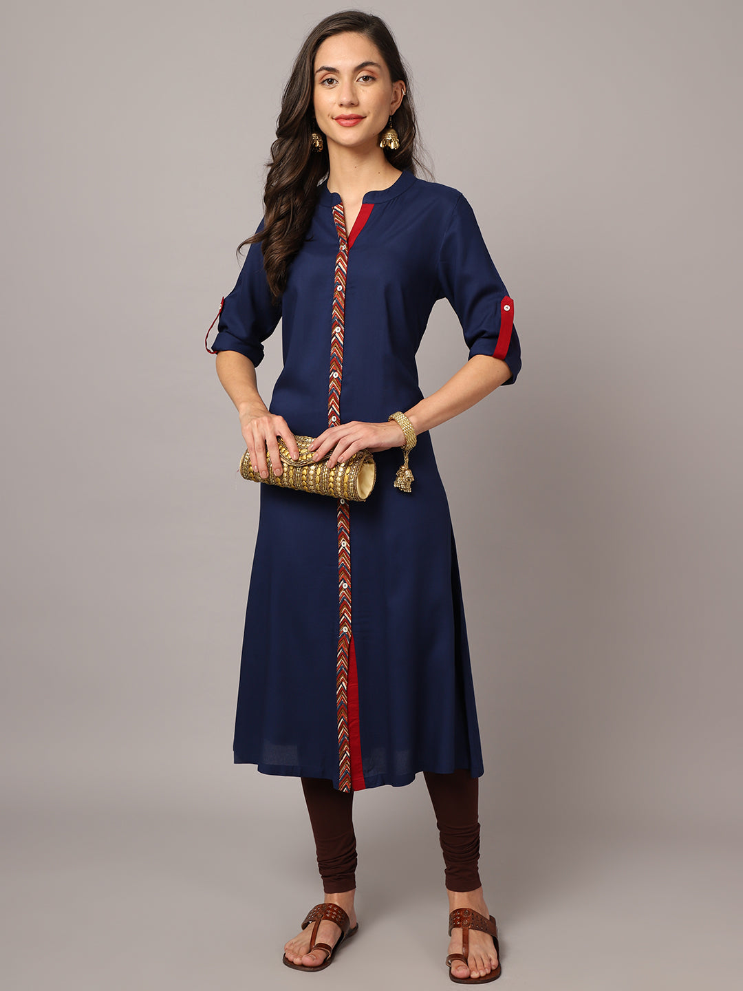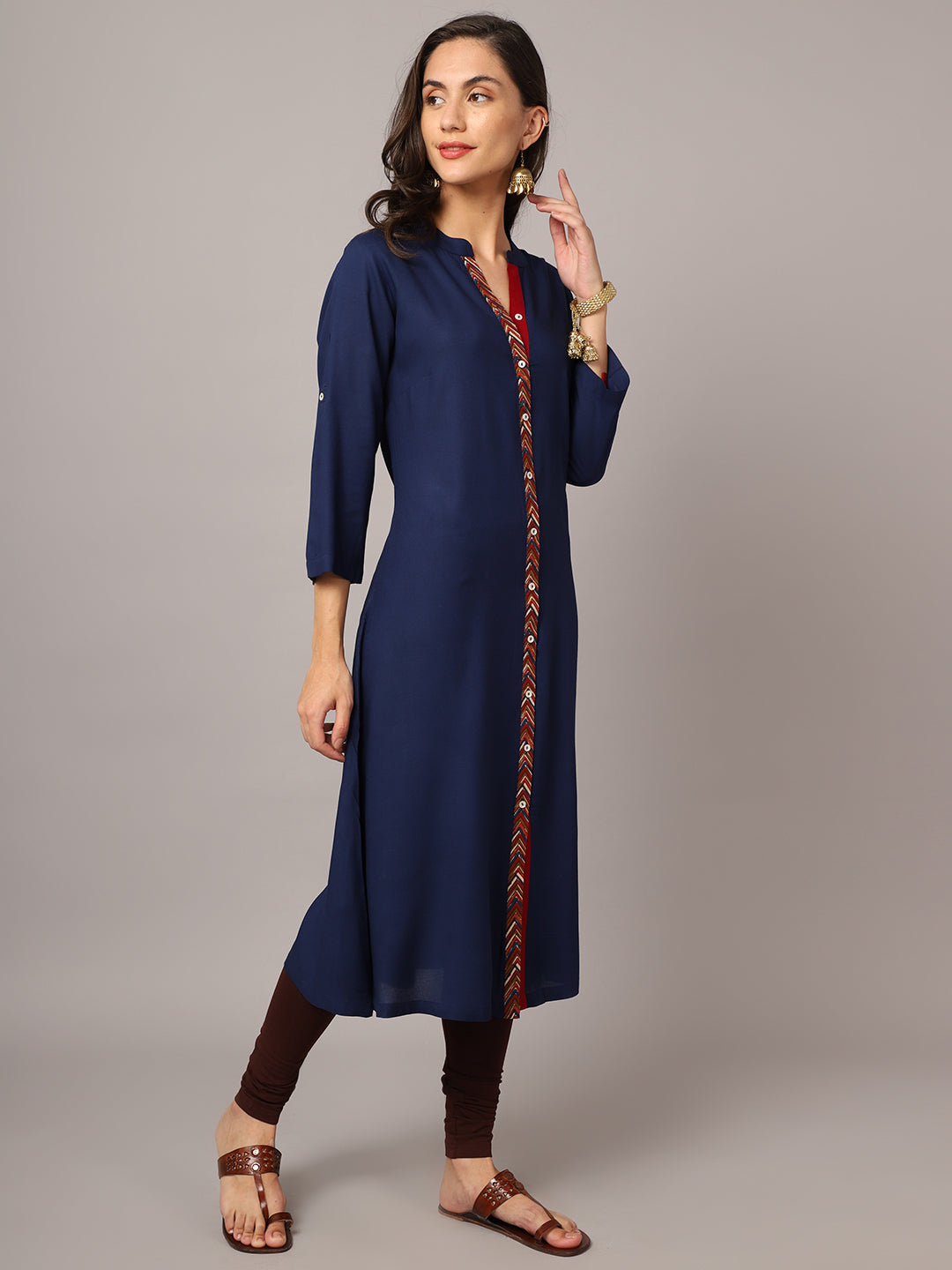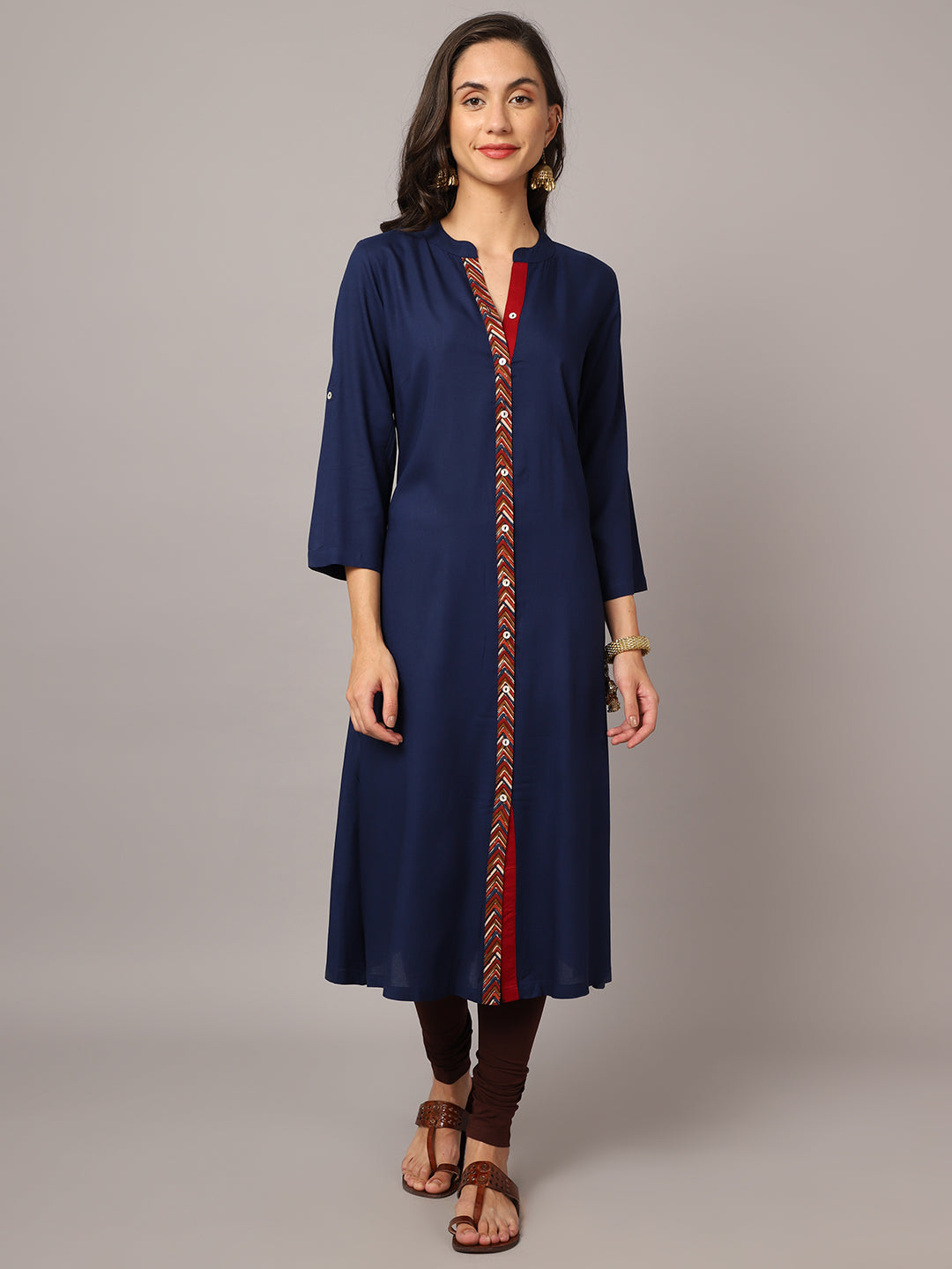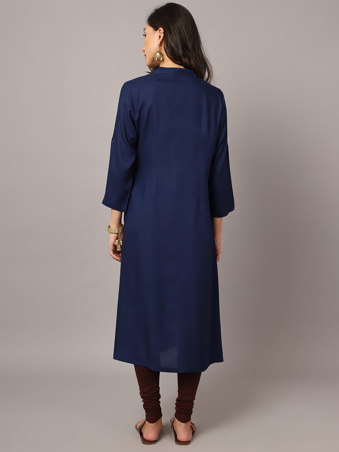 Women's Band Collar Navy Blue Solid & Printed Calf length Kurti