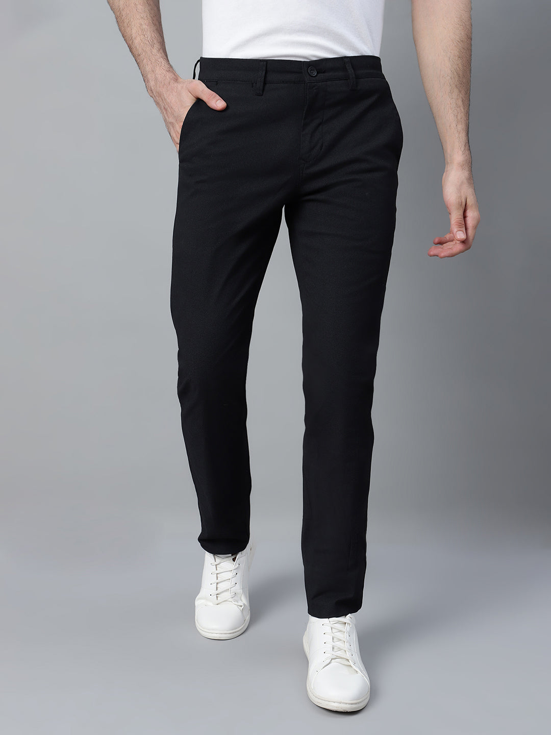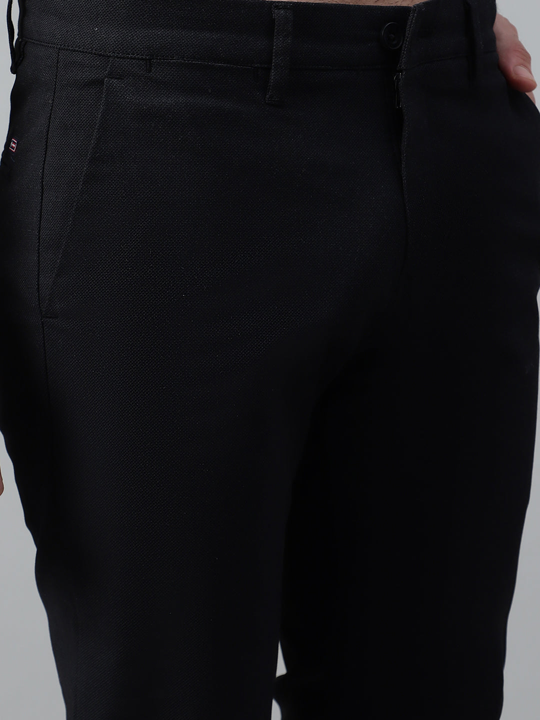 Men's Black Self Design Non-Pleated Stretchable Casual Trouser