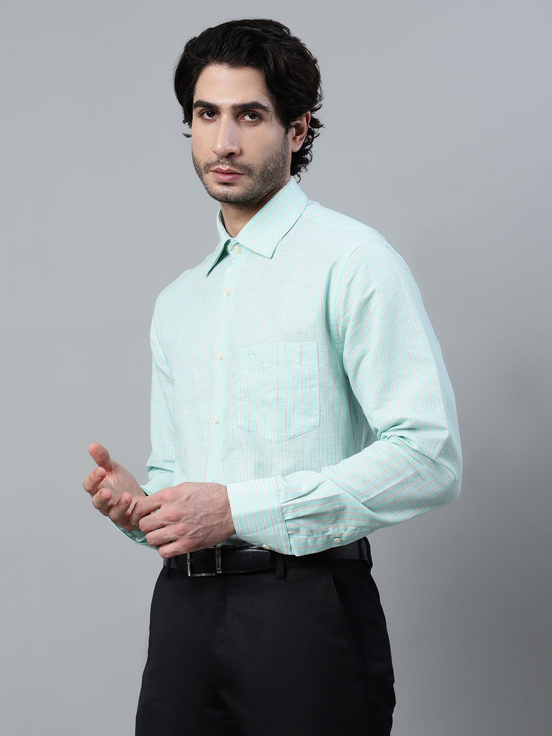Men's Light Green Formal Narrow Stripe Full Sleeve Shirt