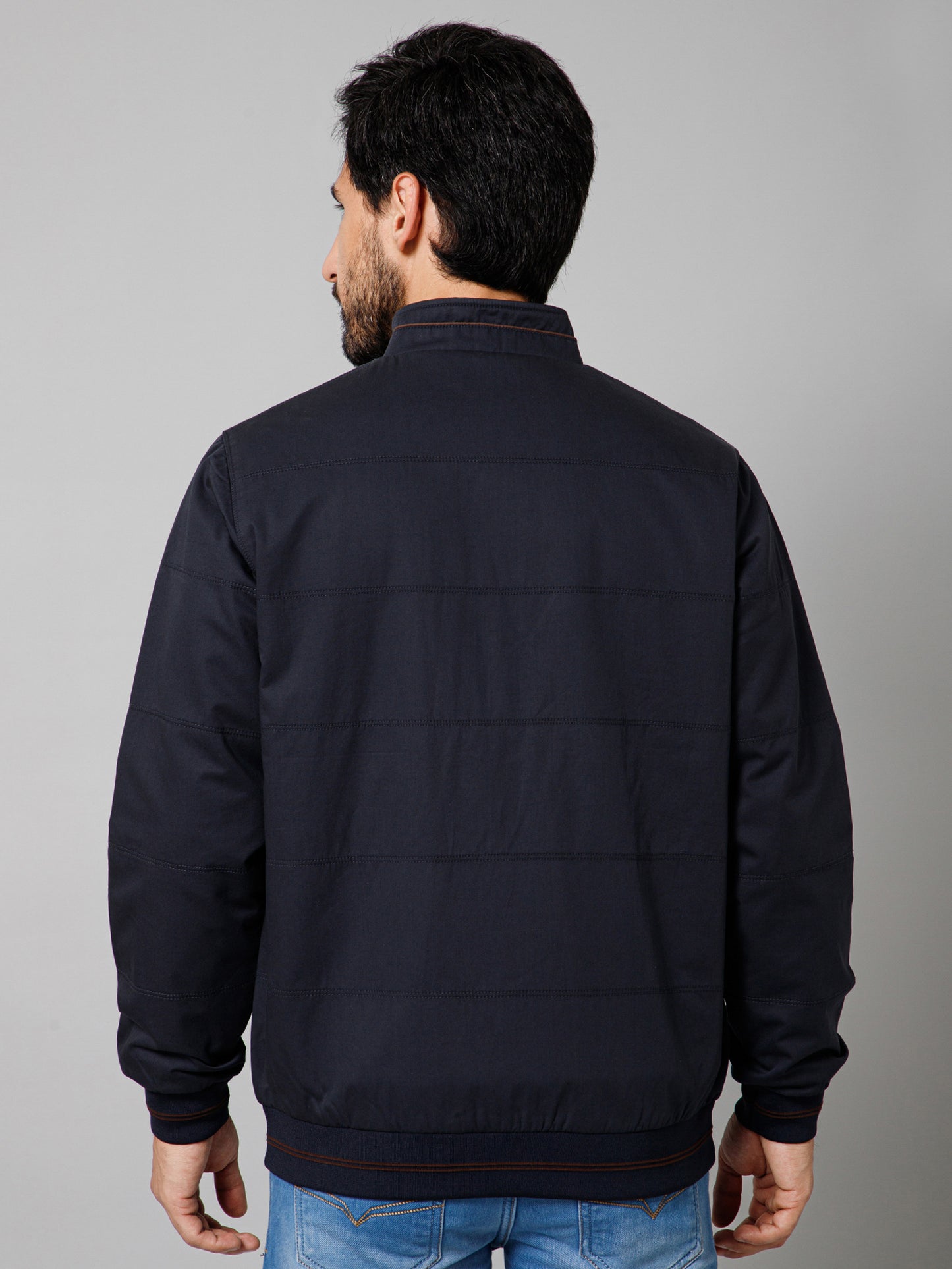 Solid Full Sleeves Mock Collar Regular Fit Navy Blue Casual Reversible Jacket For Men
