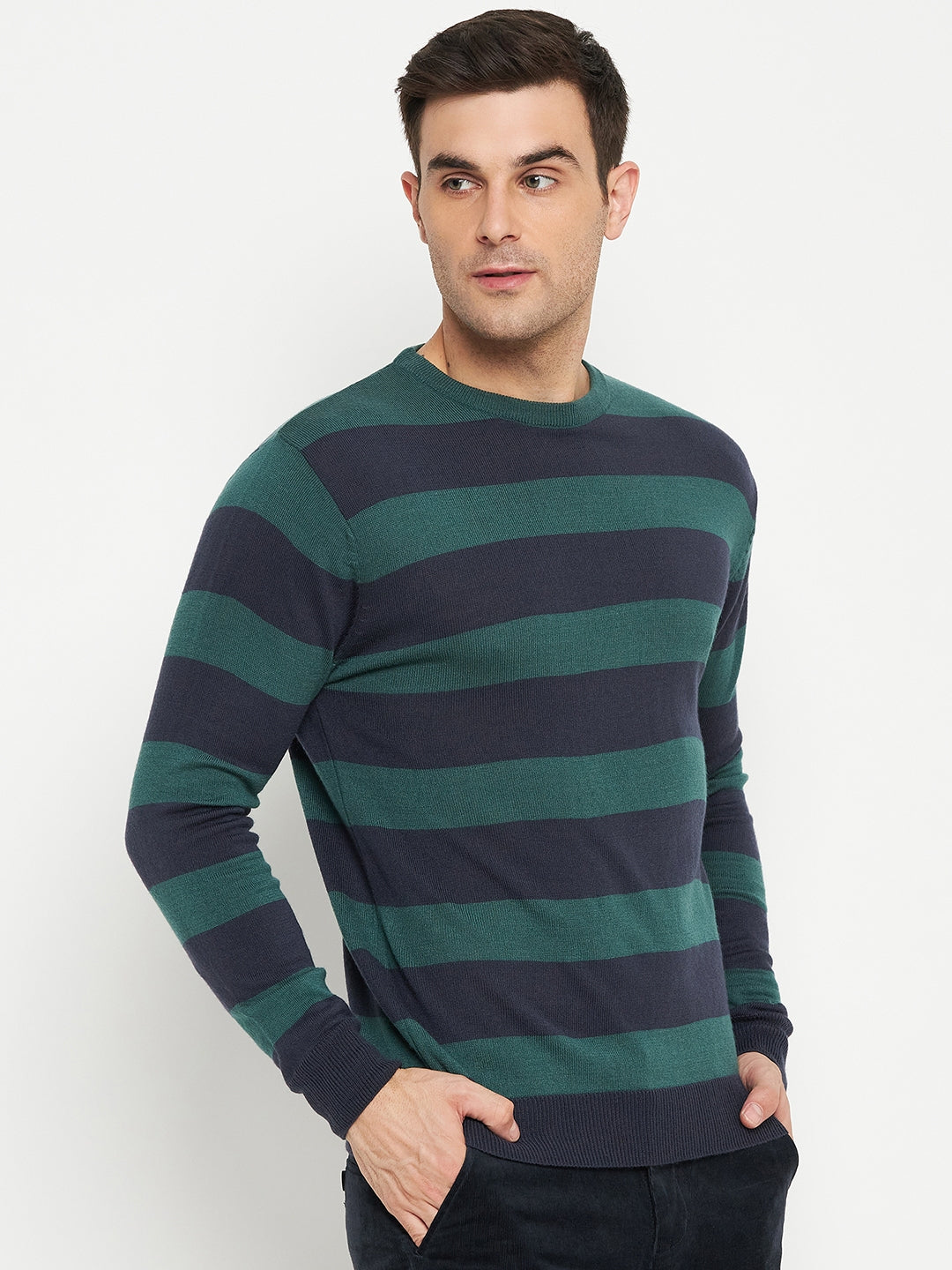 Striped Navy Blue Full Sleeves Round Neck Regular Fit Casual Sweater for Men