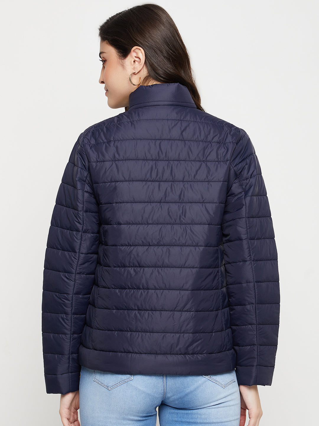 Flaunt your Winter Fashion game with our Navy Blue color jacket. This jacket is made up of finest Nylon fabric which offer the perfect blend of style and warmth. Featuring a Standing collar, Quilted pattern, full sleeves, Zipper closure with styled zipper pockets makes it perfect for office, travel or for a casual day which gives you all day comfort & fashion. Dry clean only. -