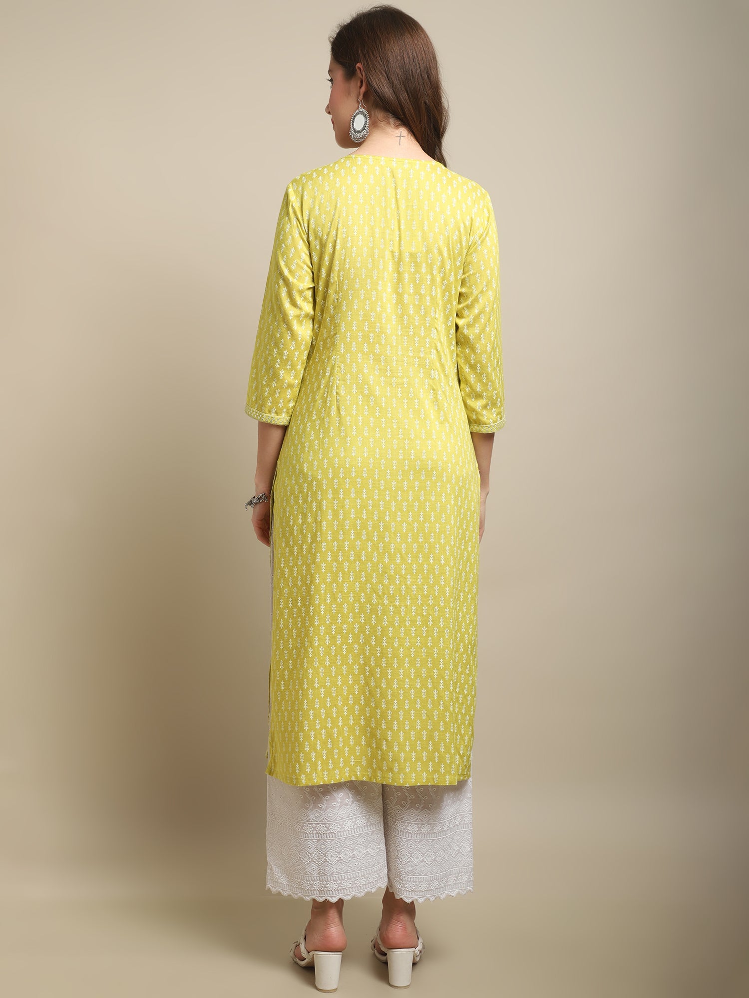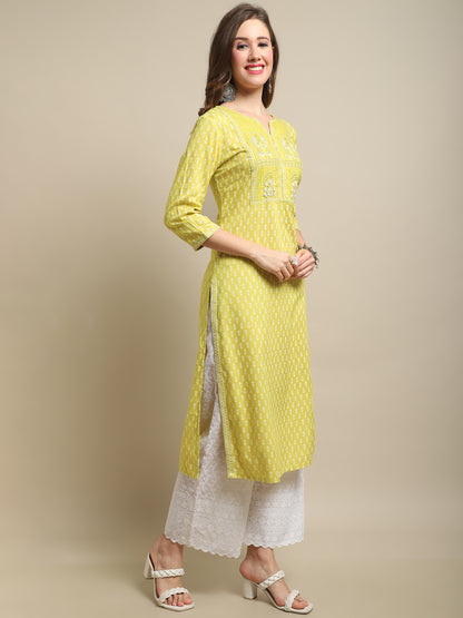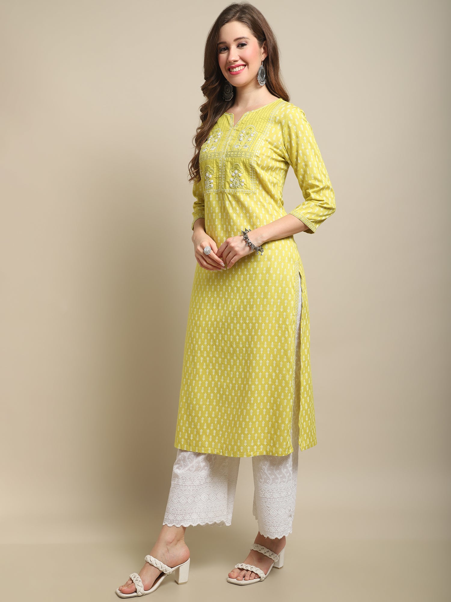 Women's Casual Round neck Green Printed & Embroidered Calf length Kurti