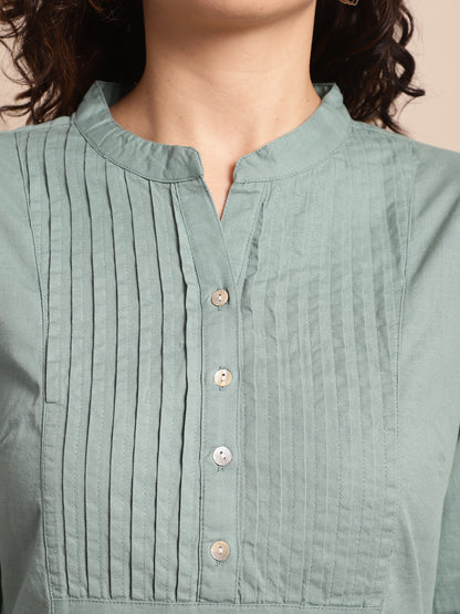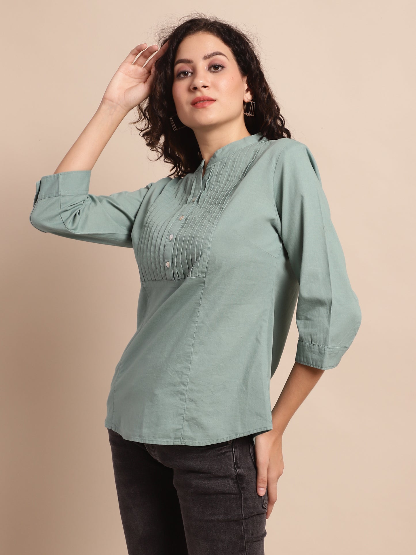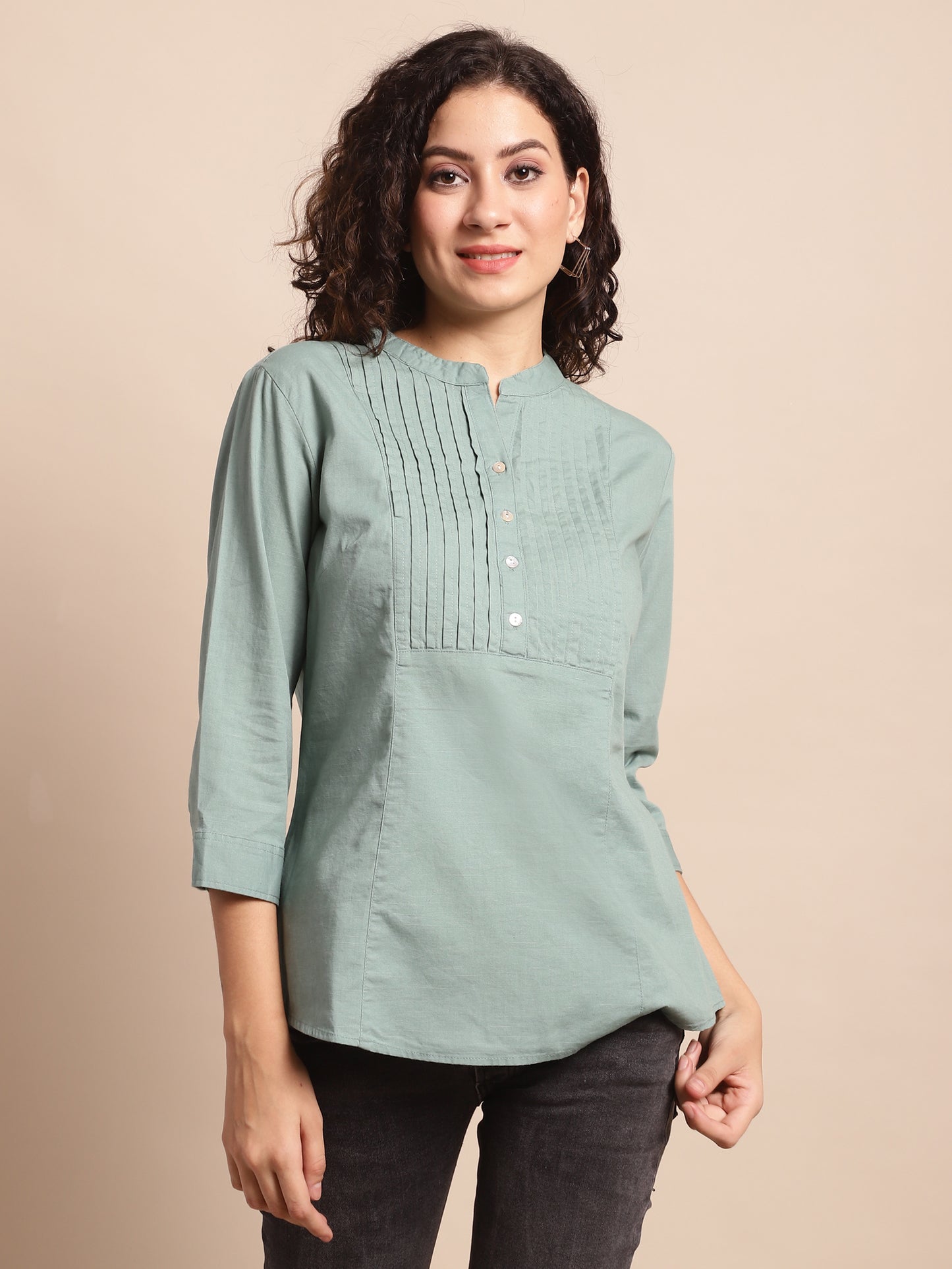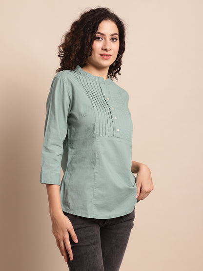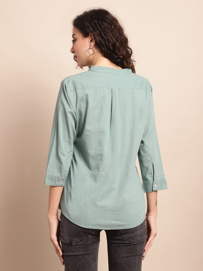 Women's Casual Aqua Green Solid Mandarin Collar Tunic