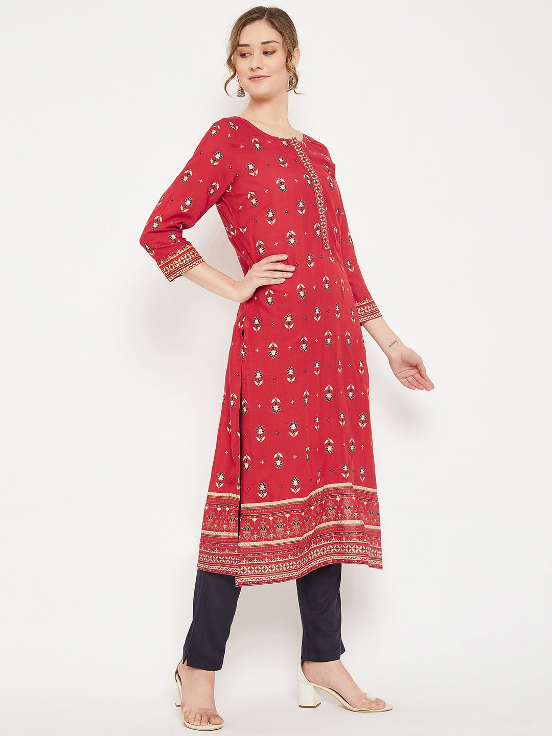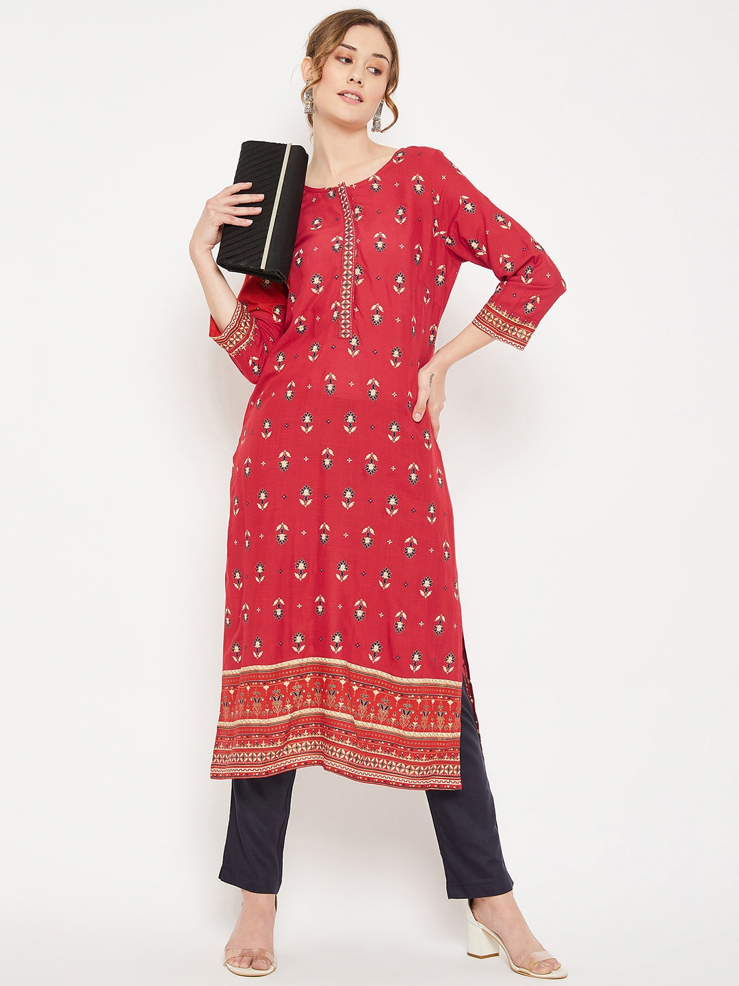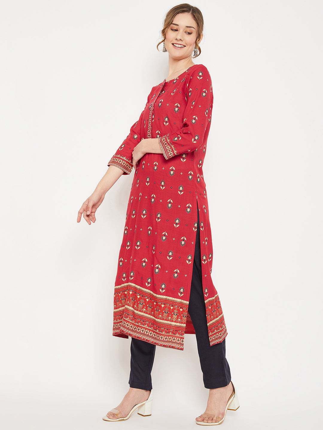 Women's Casual Round neck Red All over Printed Calf length Kurti