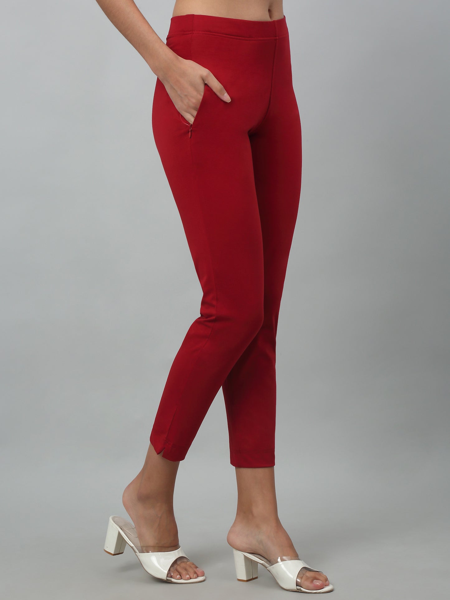 Women's Basic Regular Fit Red Flat Front Mid rise Kurti Pant