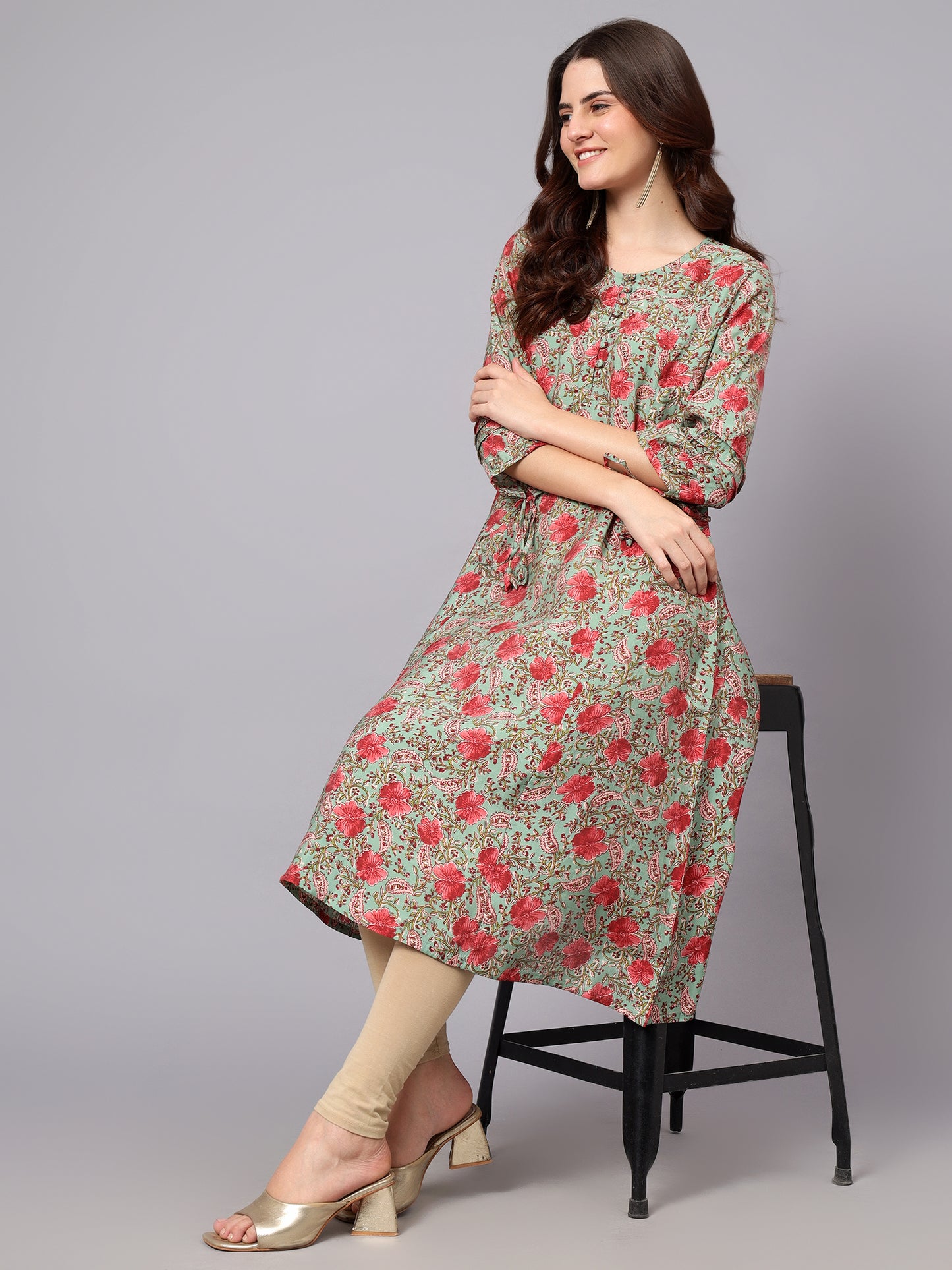 Women's Green Floral Printed 3/4th Sleeves Kurti