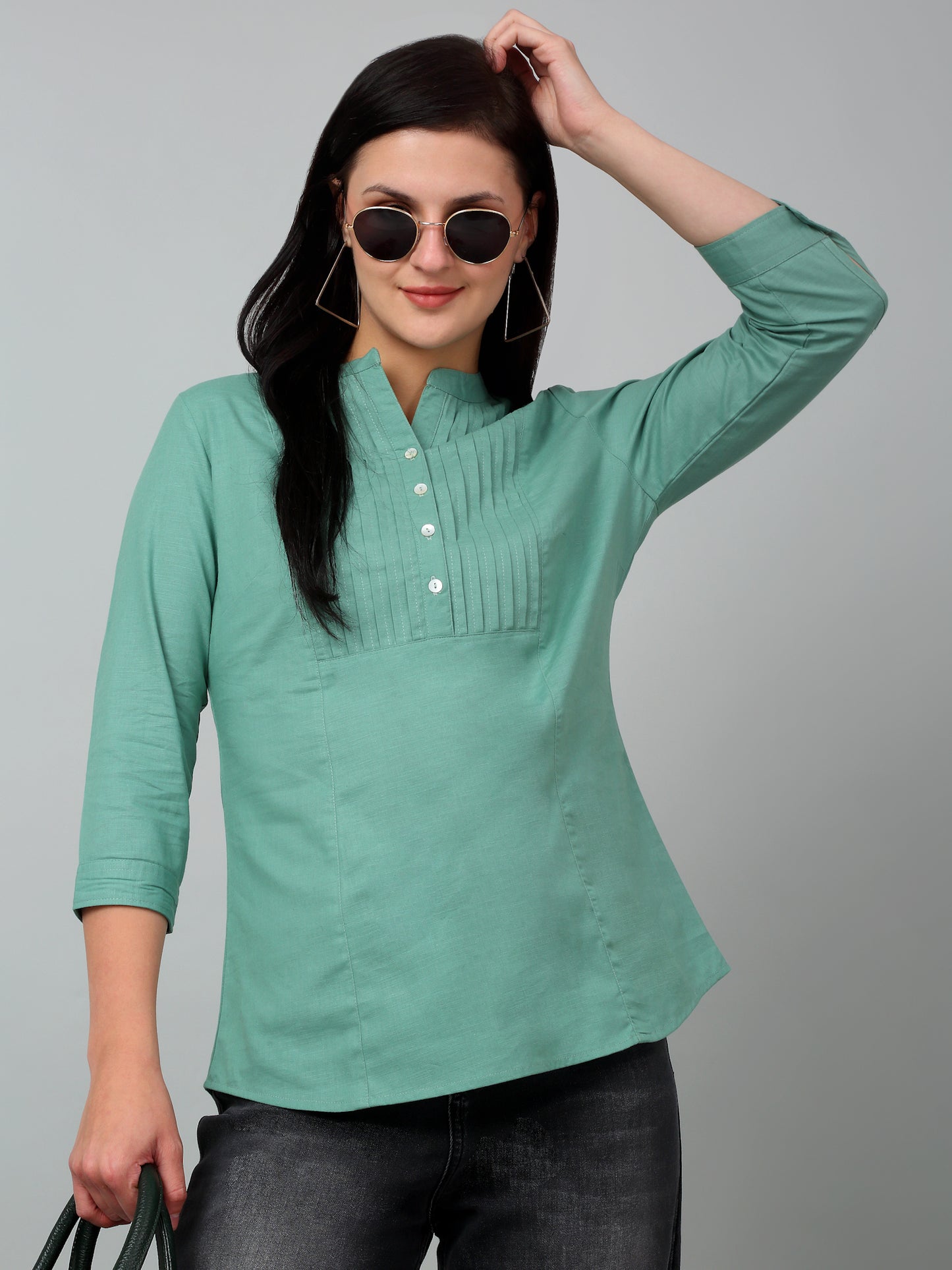 Women's Casual Light Green Solid Mandarin Collar Tunic