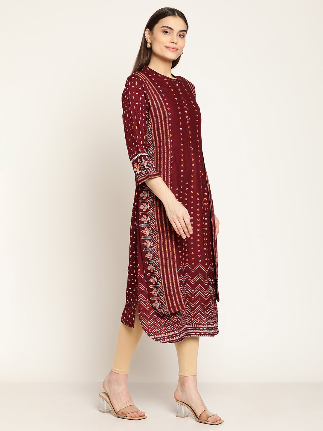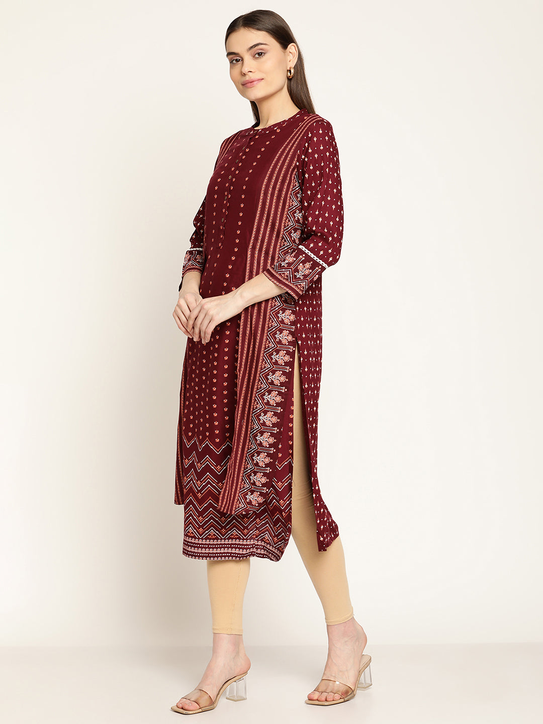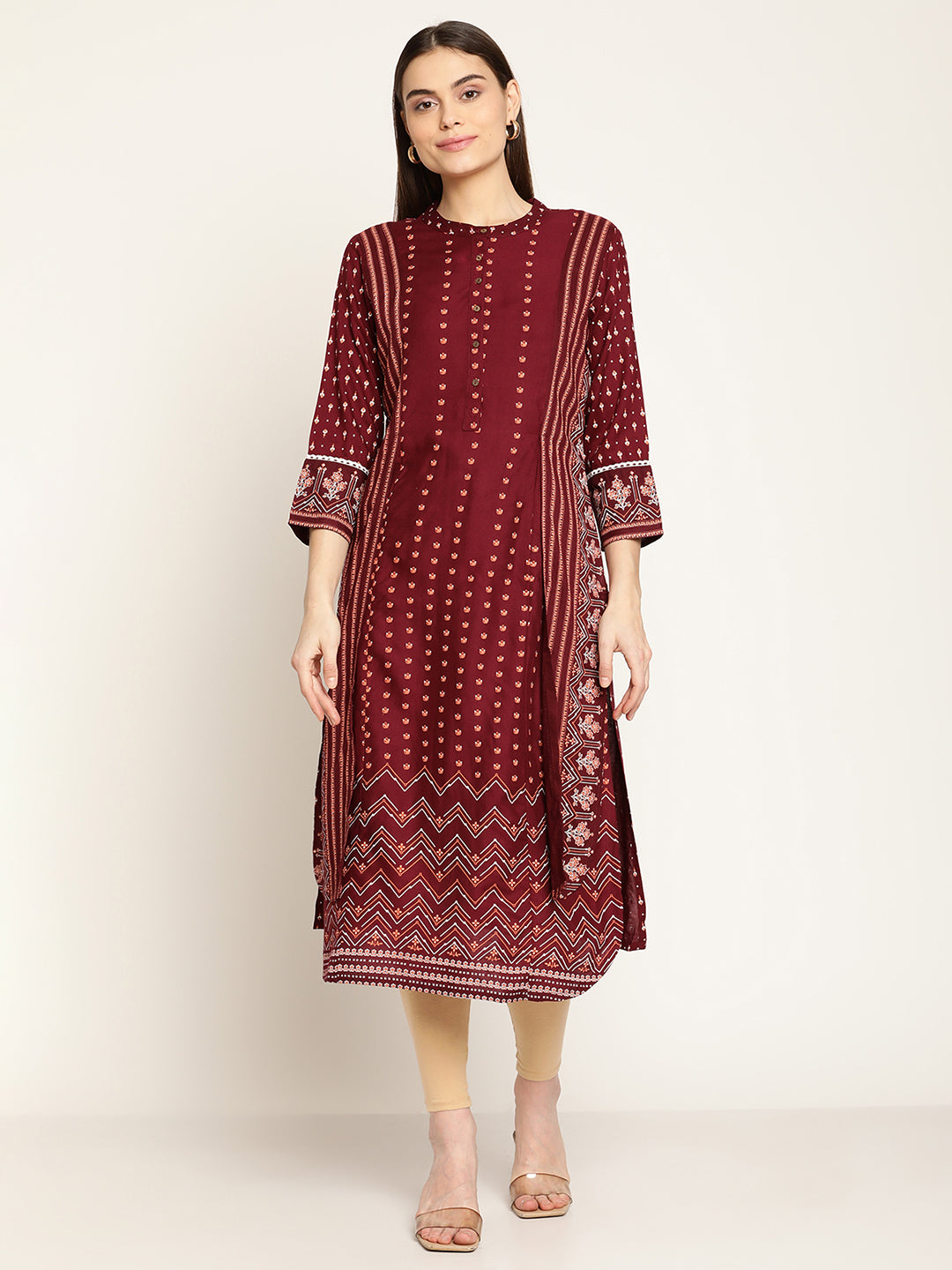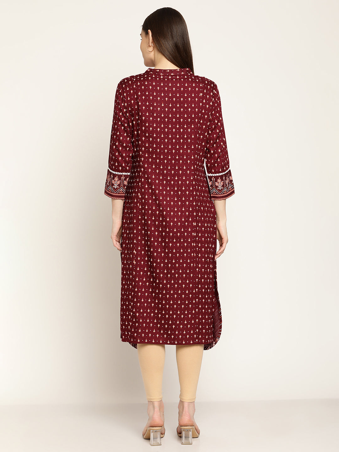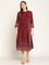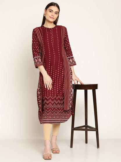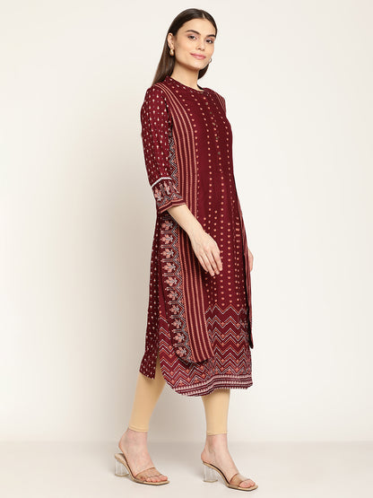 Women's Casual Round neck Maroon Printed Calf length Kurti