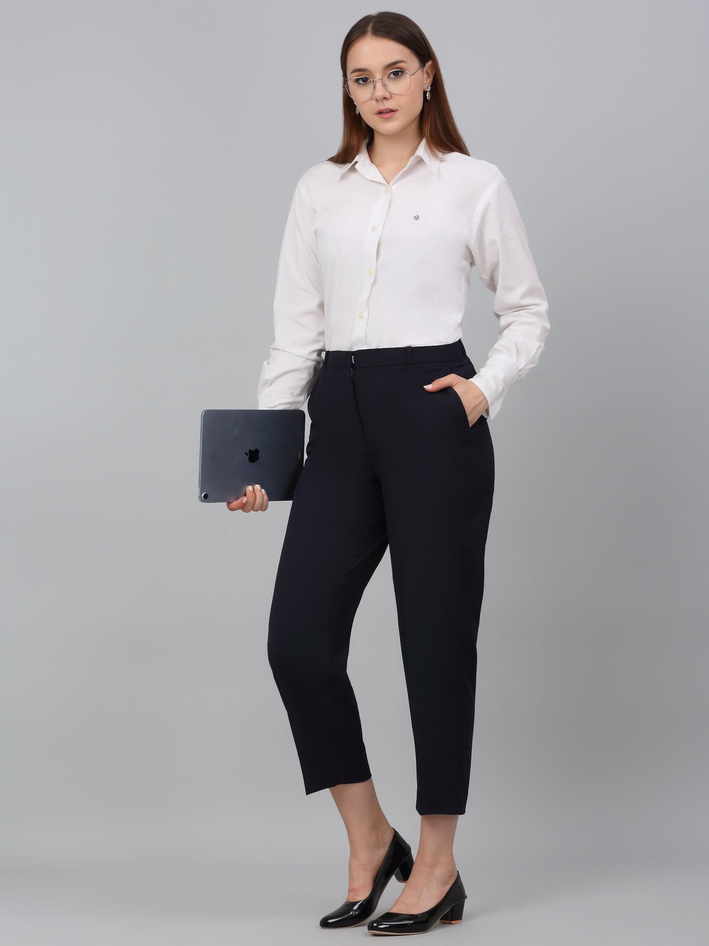 Women's Navy Blue Solid Non-Pleated Formal Trouser