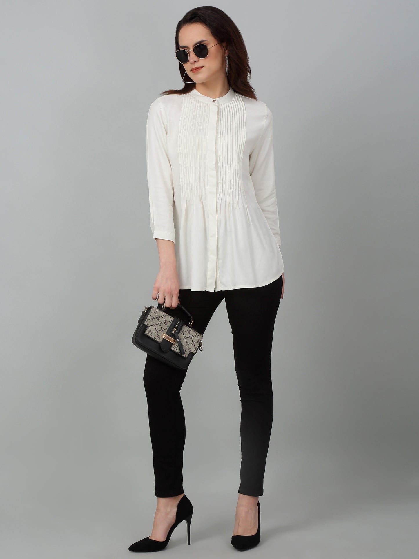 Women's Casual Offwhite Solid Mandarin Collar Tunic