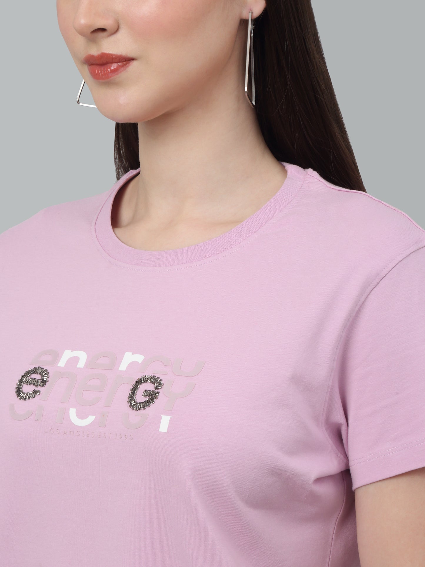 Women's Casual Regular Short Sleeve Lilac Round neck Bead work & Print T-Shirt