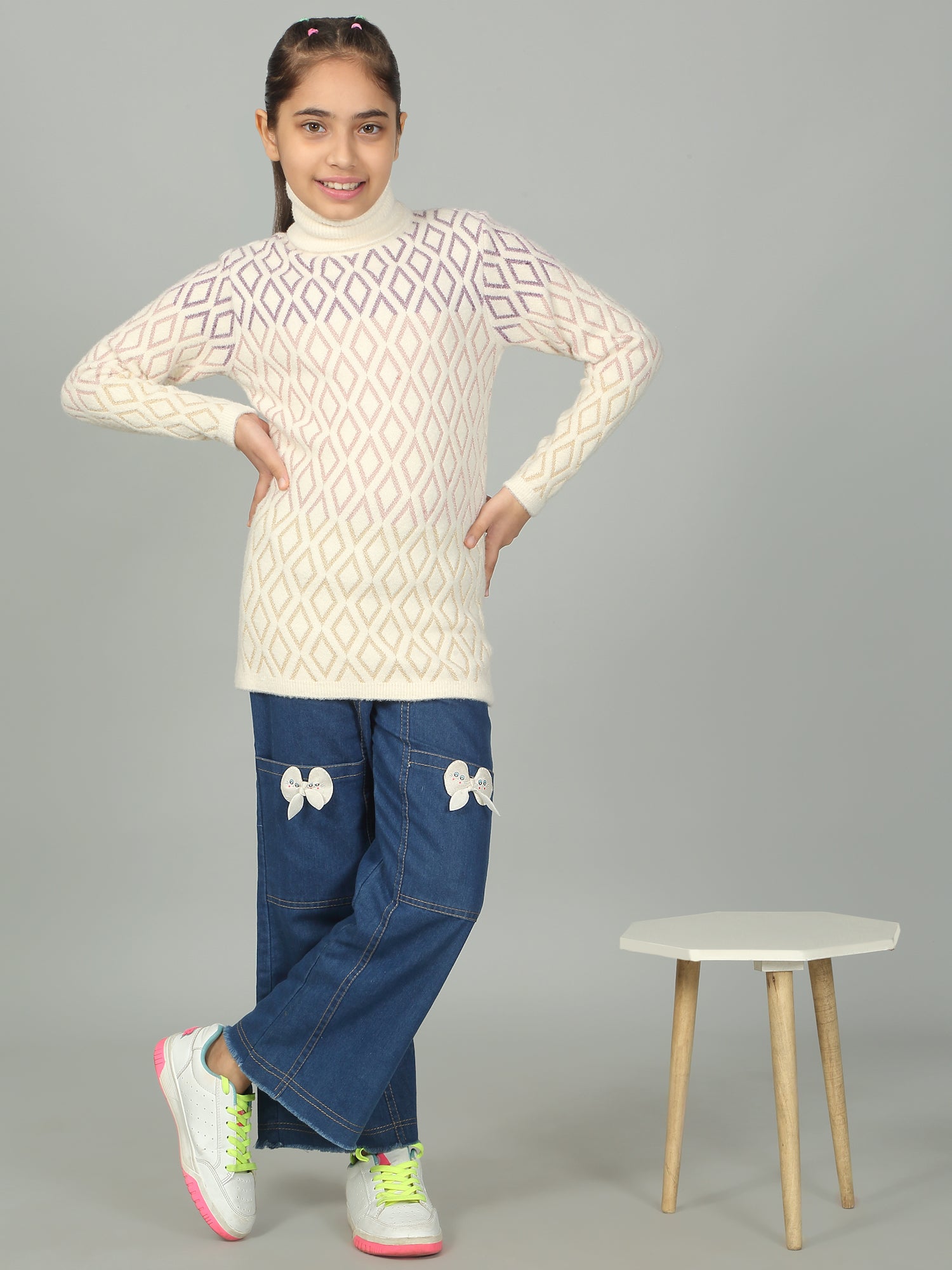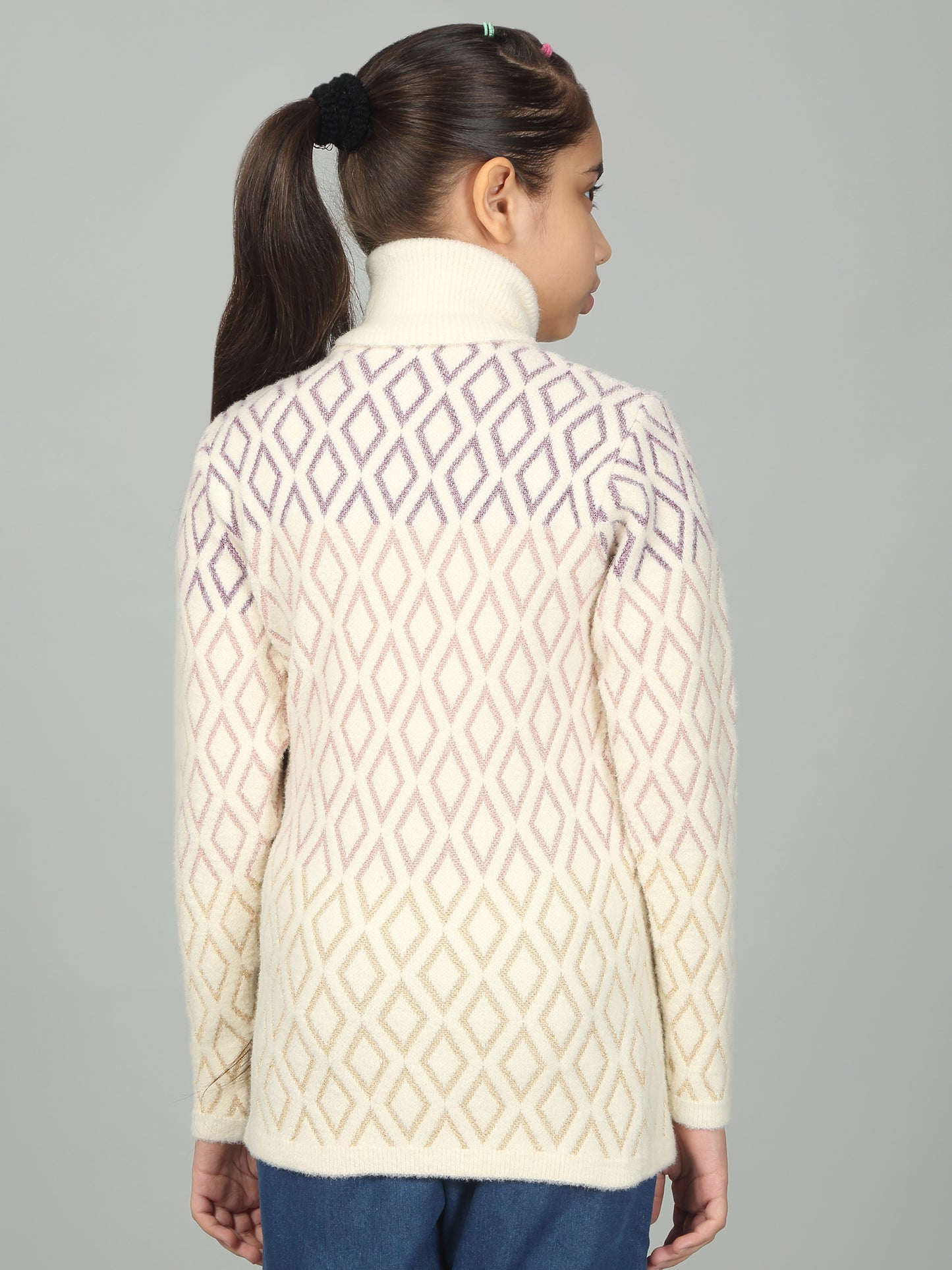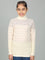 Girls Casual Self Design Cream Full Sleeves Sweater