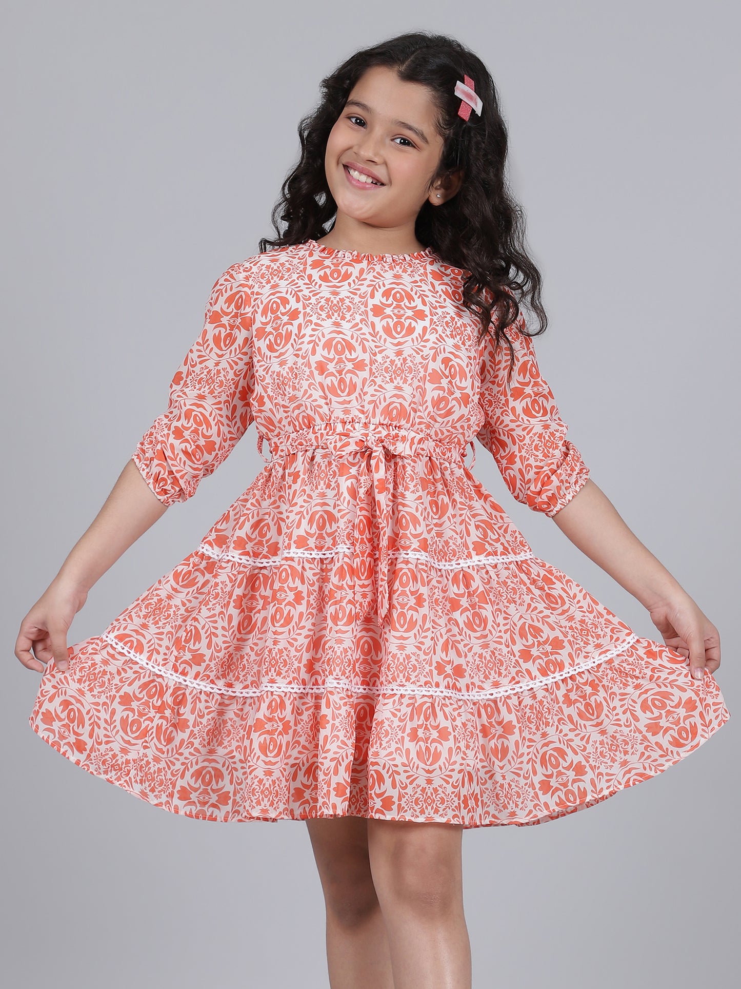 Girls Printed Orange Round Neck 3/4th Sleeves Casual Dress