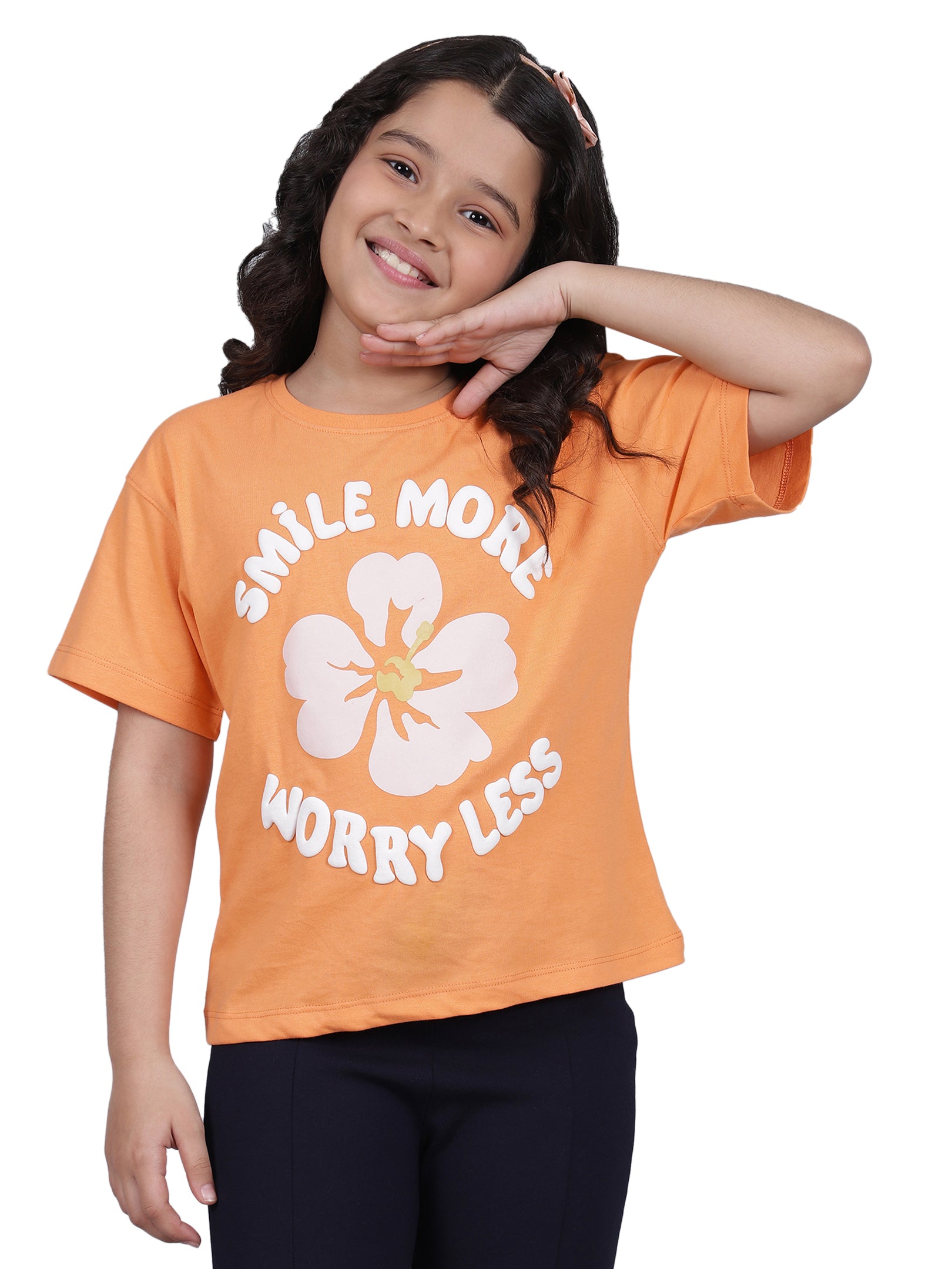 Girls Printed Orange Round Neck Half Sleeves Casual T-Shirt