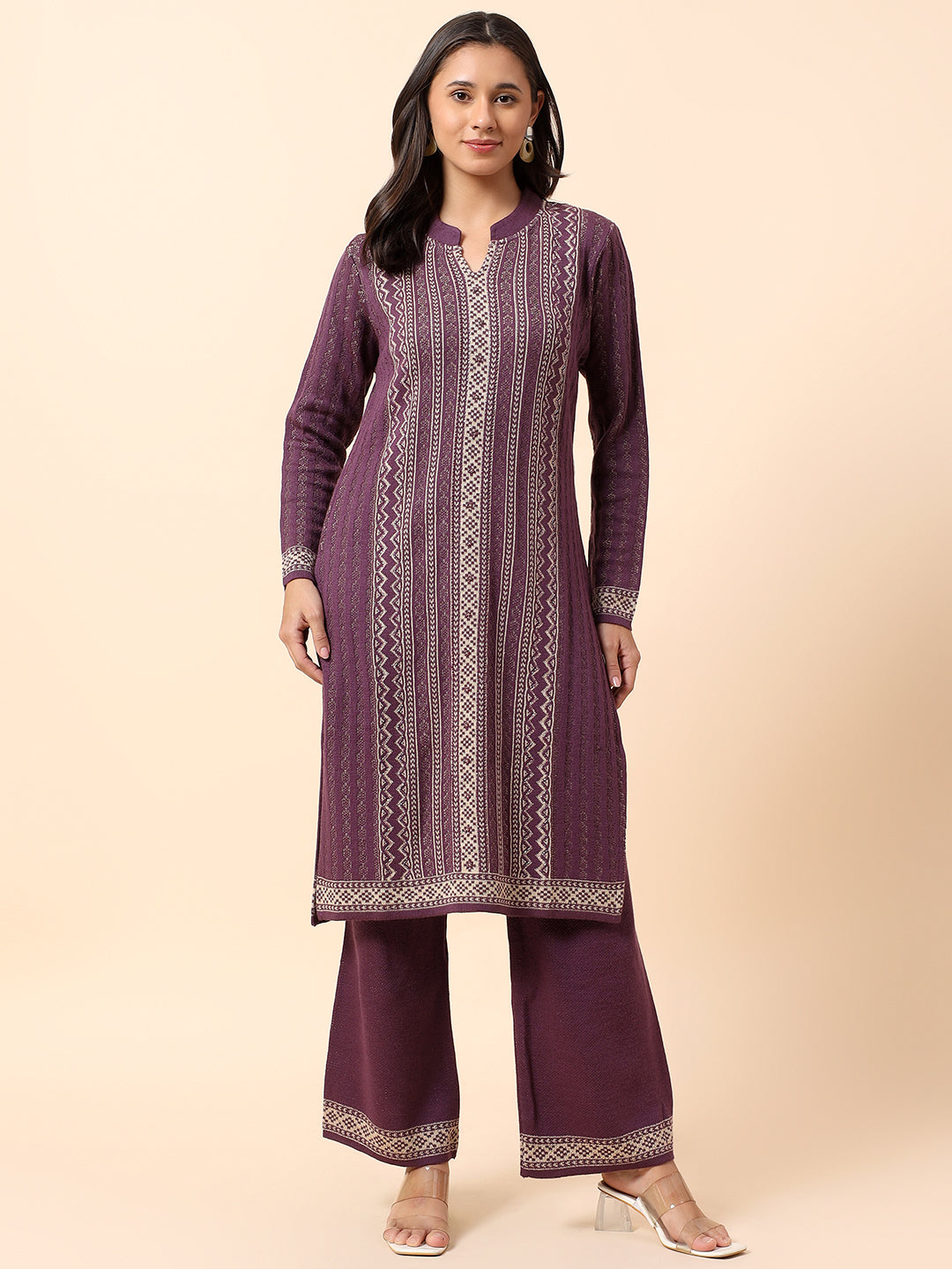 Kurti Palazzo Set for Women | Winter Wear Mandarin Collar Acrylic Fabric Printed Pattern