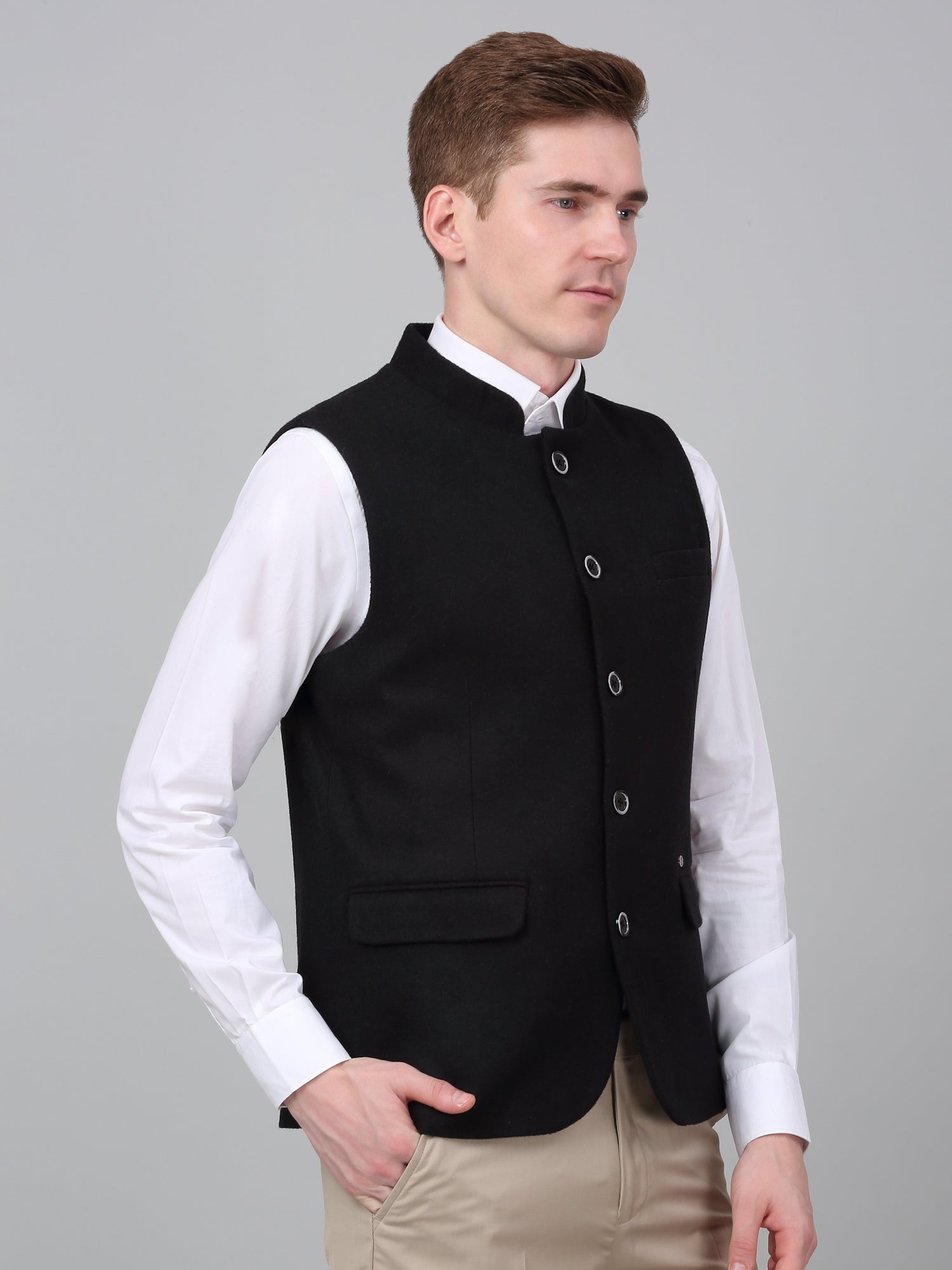Men Black Self Design Formal Band Collar Sleeveless Waist Coat