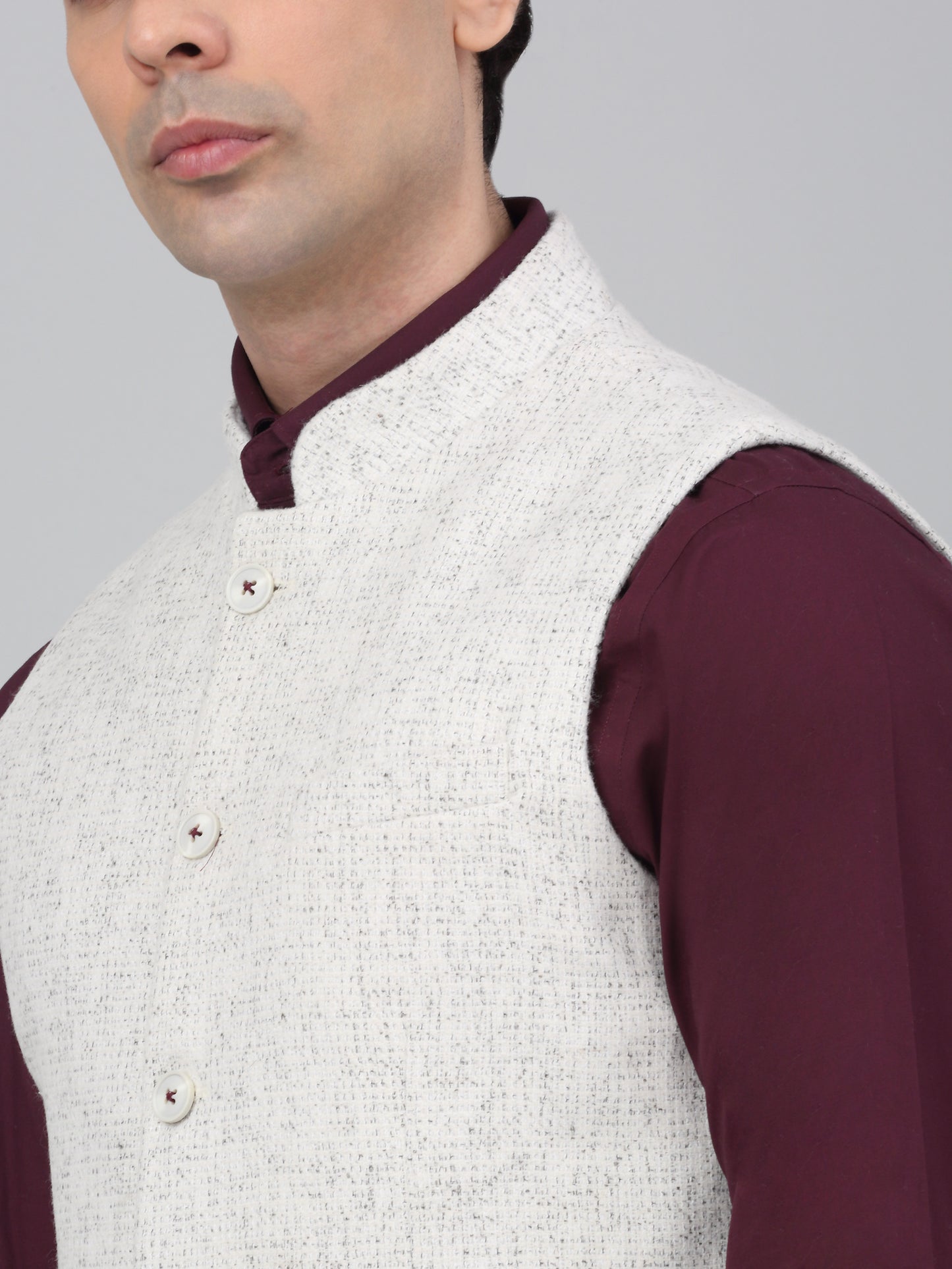 Men Cream Self Design Mandarin Collar Casual Waistcoat