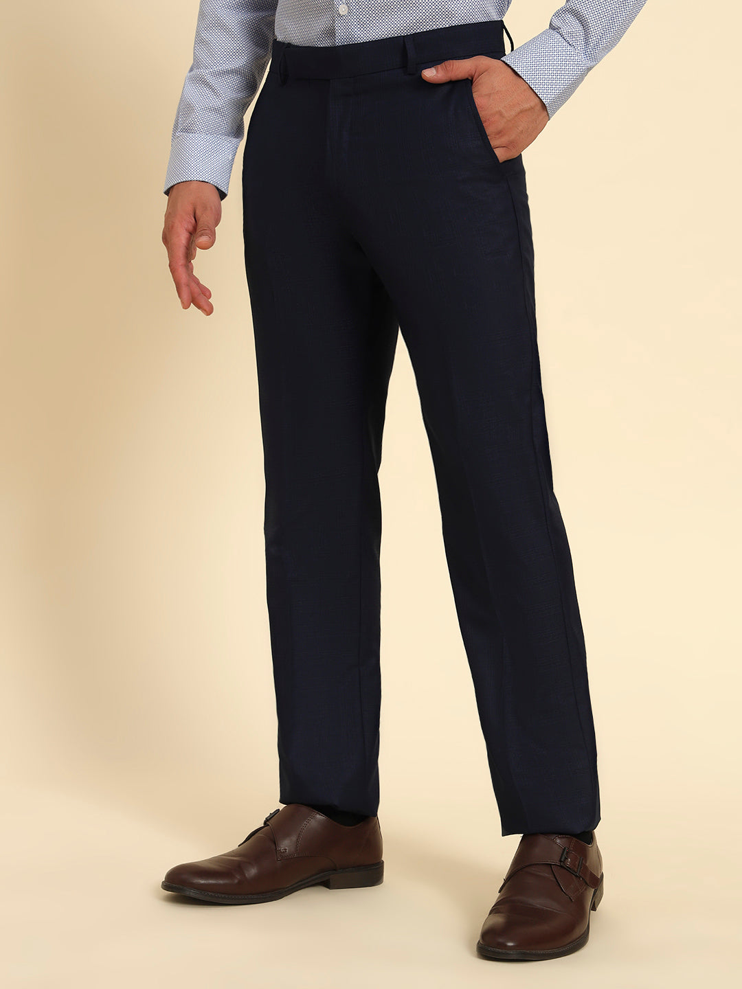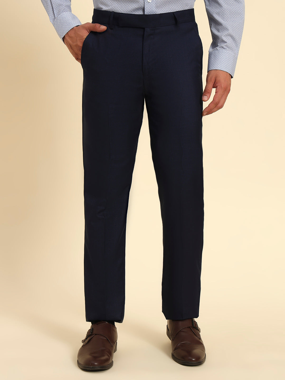 Men Navy Blue Checkered Regular Fit Formal Trouser