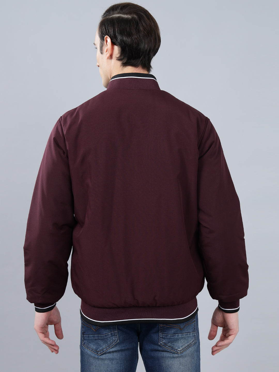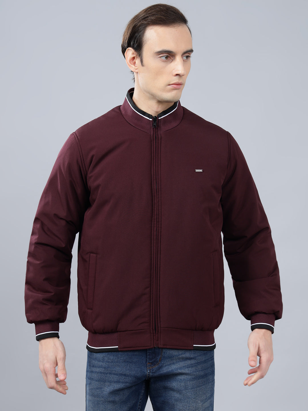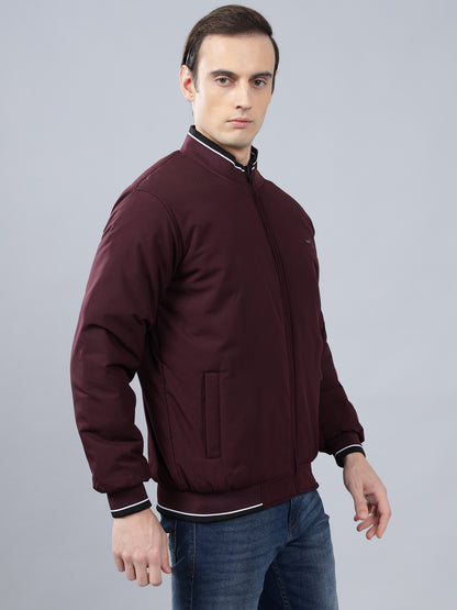 Men's Wine Solid Mock Neck Reversible Winter Jacket