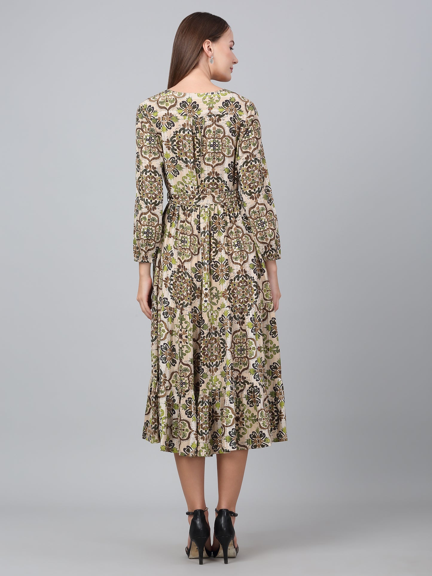 Level Up your dress wardrobe with our Brown color dress. This summer dress is made up of finest Rayon fabric material. It Printed dress, V- Neck, Calf Length, 3/4th sleeves & Flared & Fit dress. Perfect for any occasion, our dresses are your go-to for creating memorable looks with best of fashion. Durable, breathable & easy to maintain. -