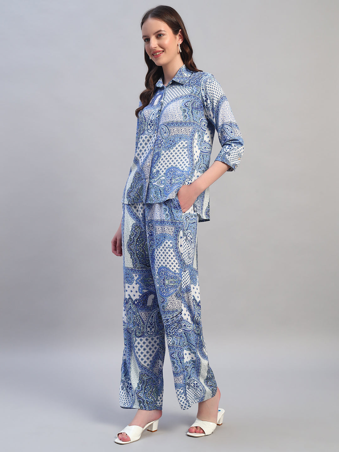 Women Printed Blue Shirt Collar 3/4th Sleeves Regular Fit Co-Ord-Set