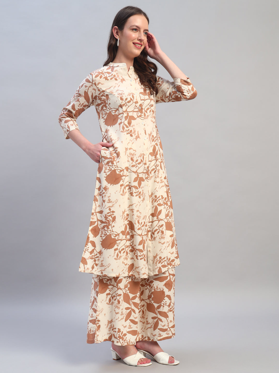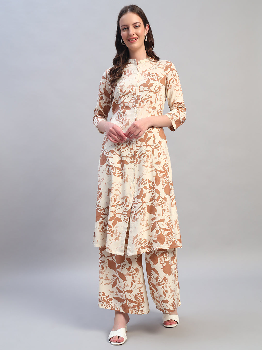 Women Printed Ivory Mandarin Neck 3/4th Sleeves Kurti Plazzo Set