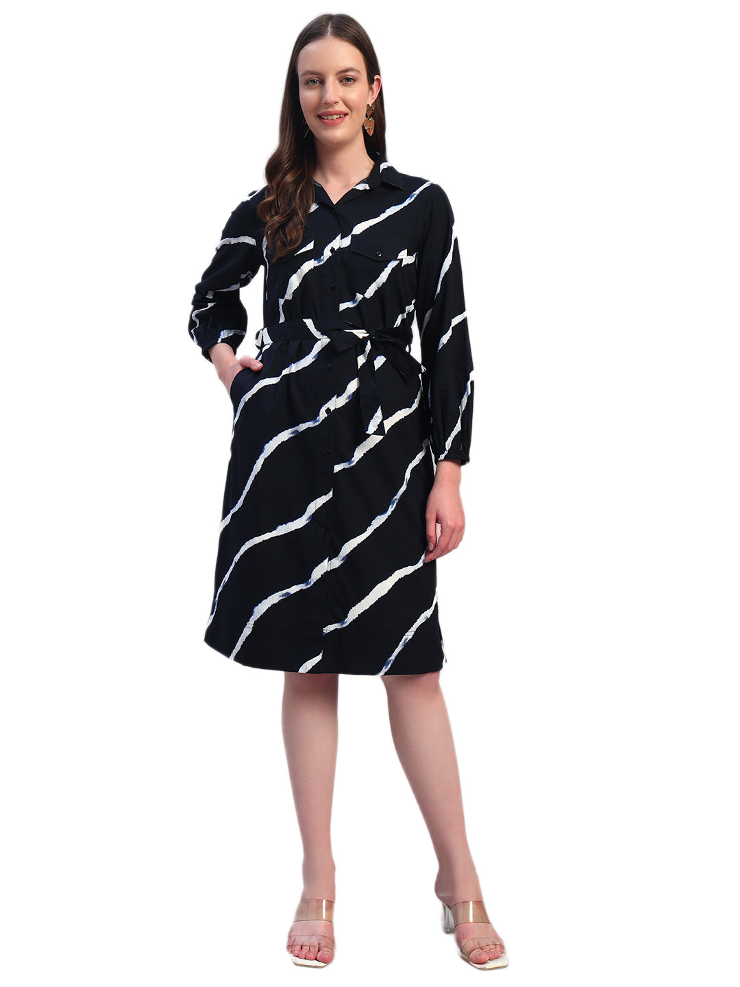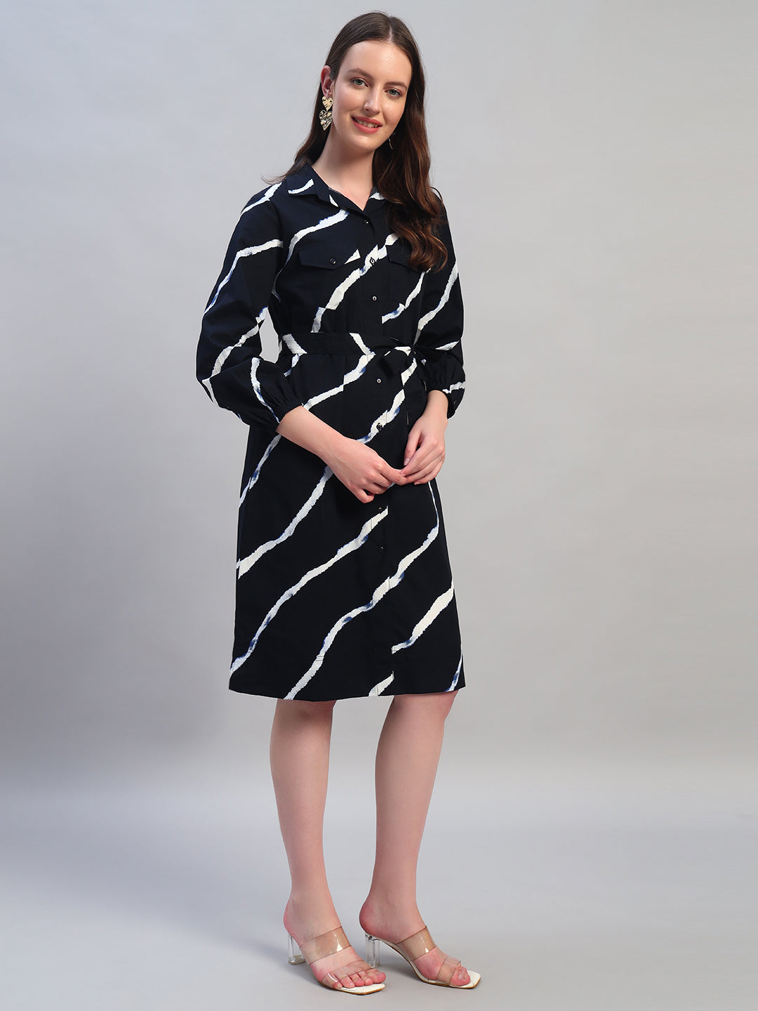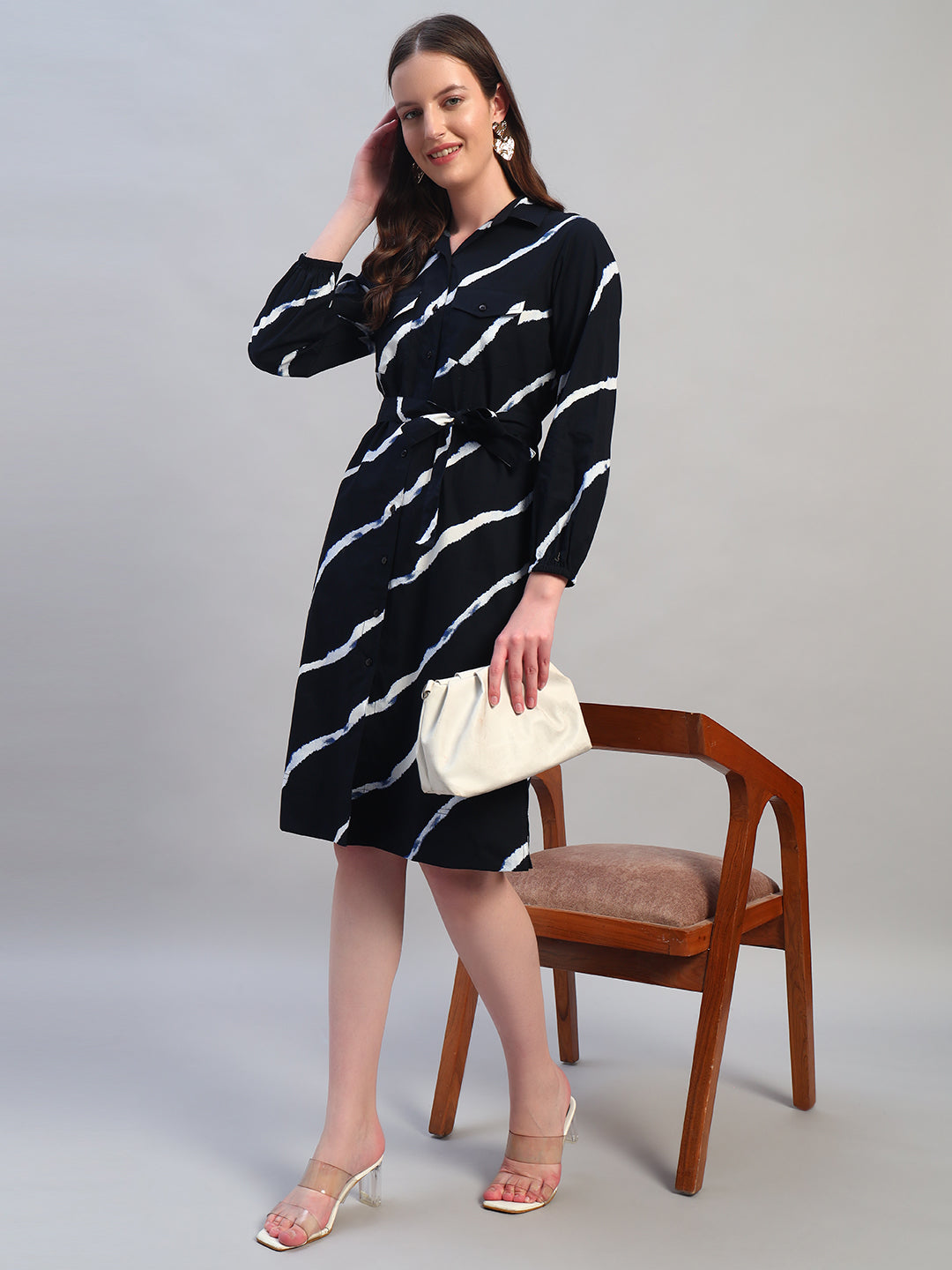 Women Printed Navy Blue Spread Collar Full Sleeves Casual Dress