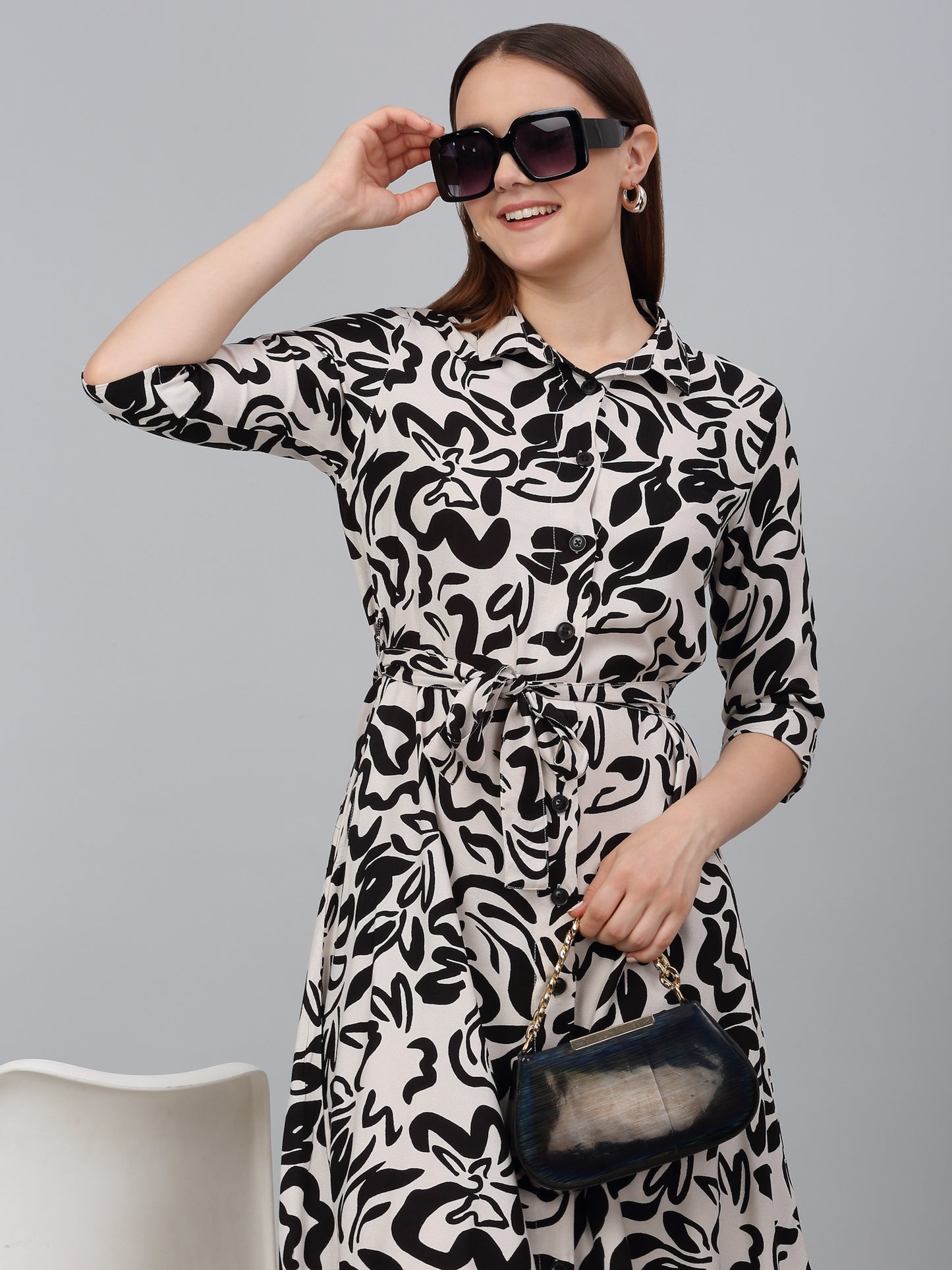 Enhance your dress wardrobe with our Black color dress. This summer dress is made up of finest Rayon fabric material. Its Printed dress, Spread Collar Neck, Calf Length, 3/4th sleeves & Flared & Fit dress. Perfect for any occasion, our dresses are your go-to for creating memorable looks with best of fashion. Durable, breathable & easy to maintain. -