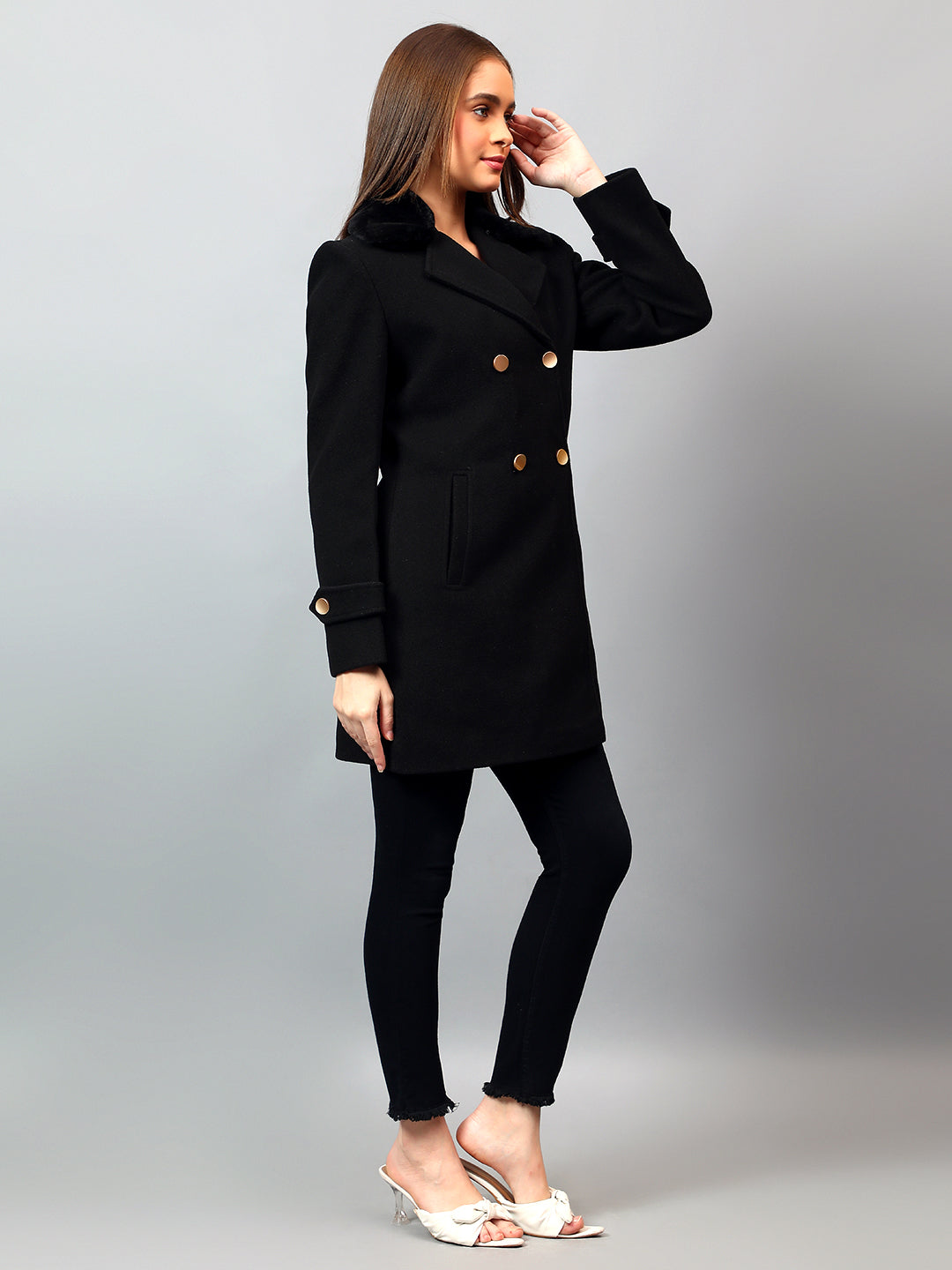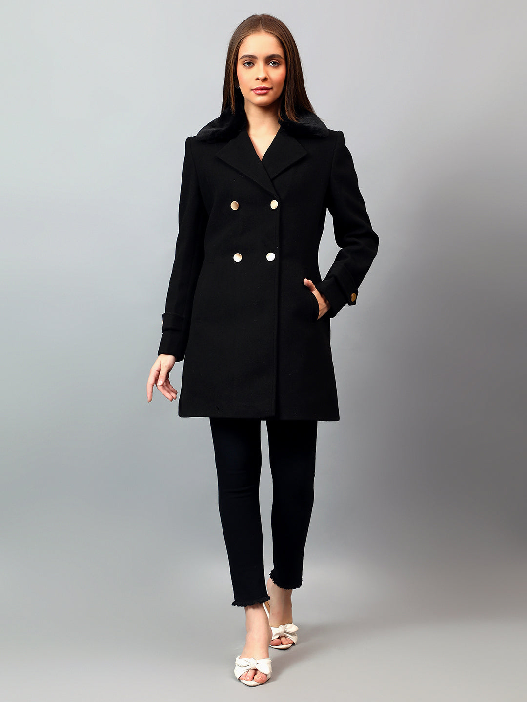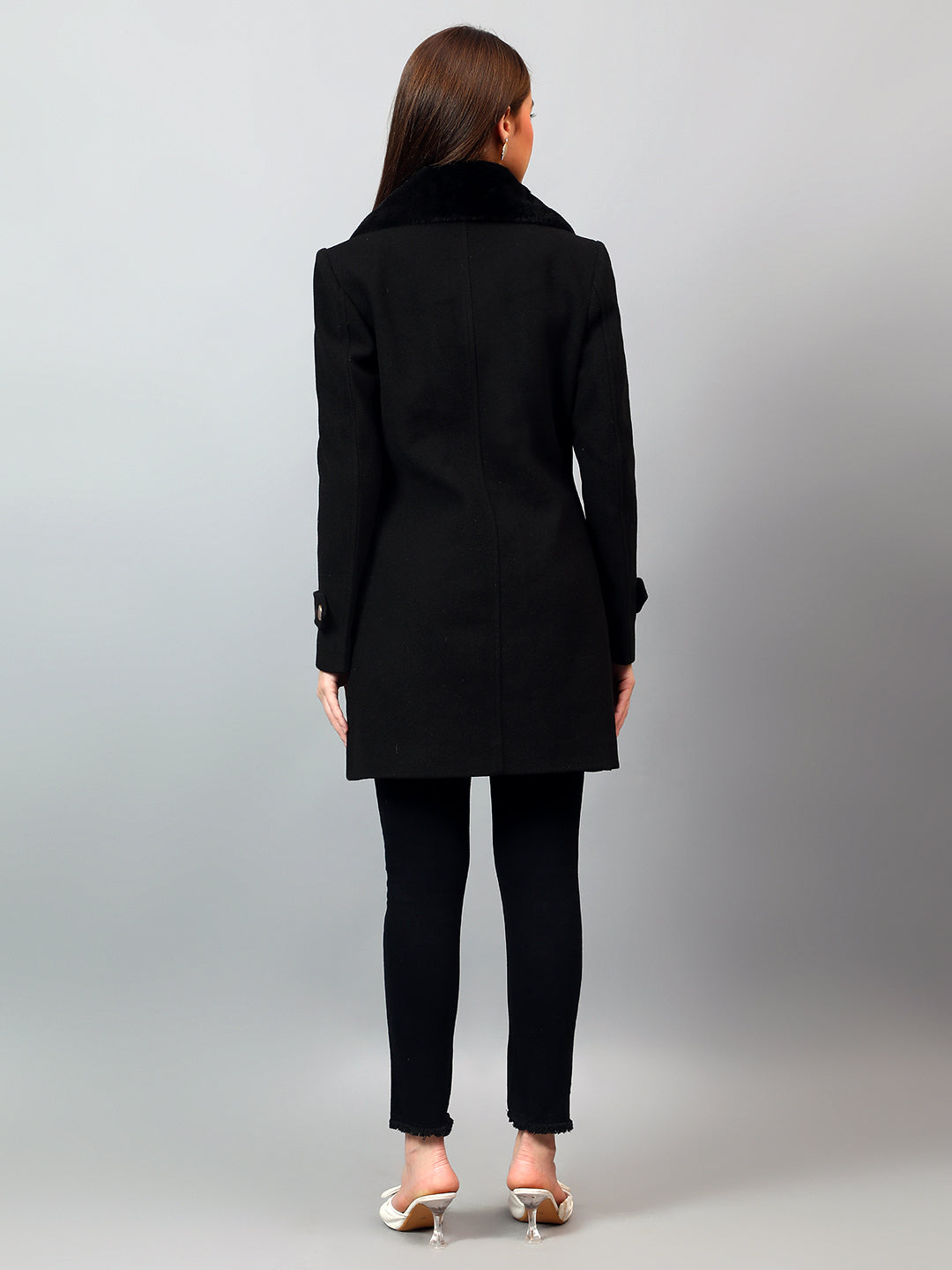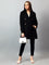 Women's Black Solid Full Sleeves Winter Long Coat