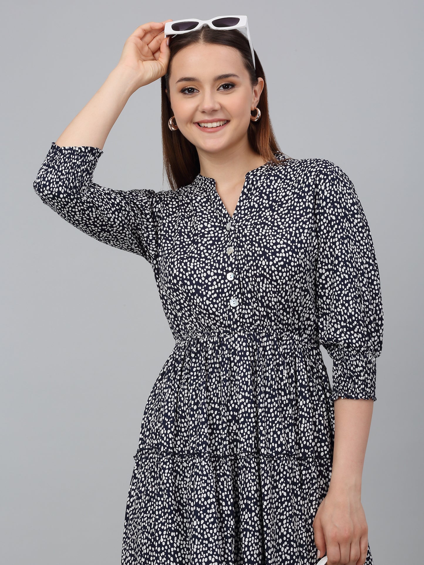 Women's Blue Printed Mandarin Collar Casual Dress