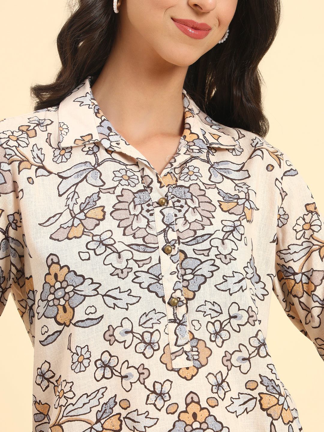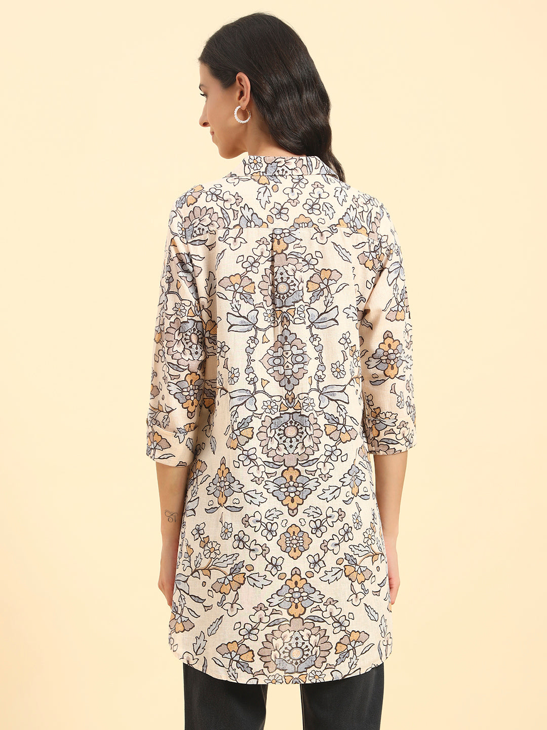Women's Brown Printed 3/4th Sleeve Shirt Collar Casual Tunic
