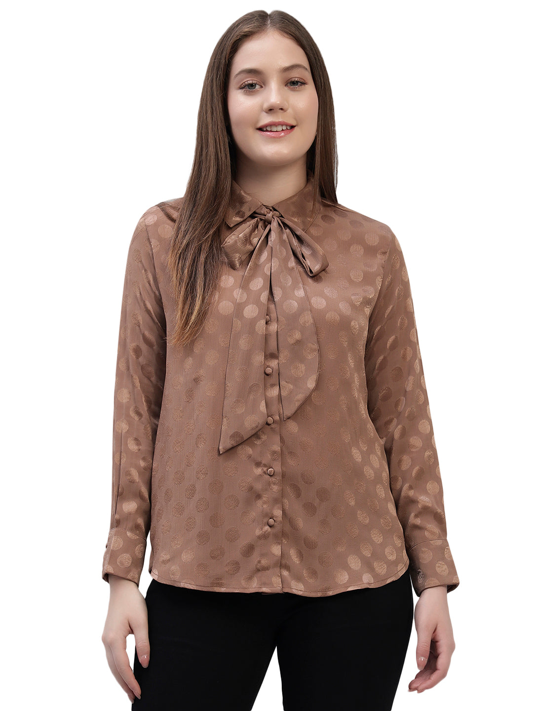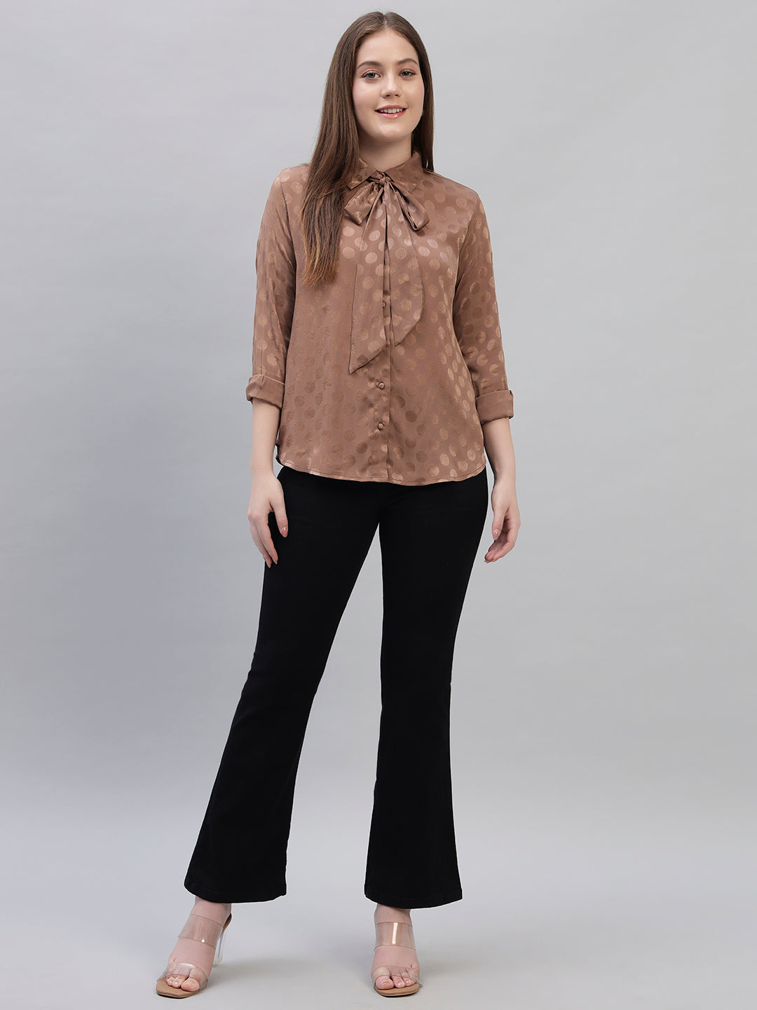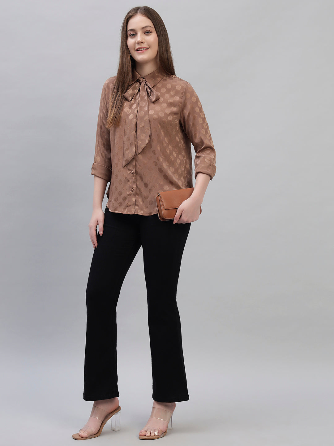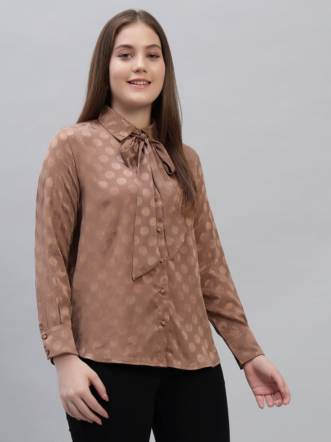 Women's Brown Self Design Full Sleeves Spread Collar Casual Top