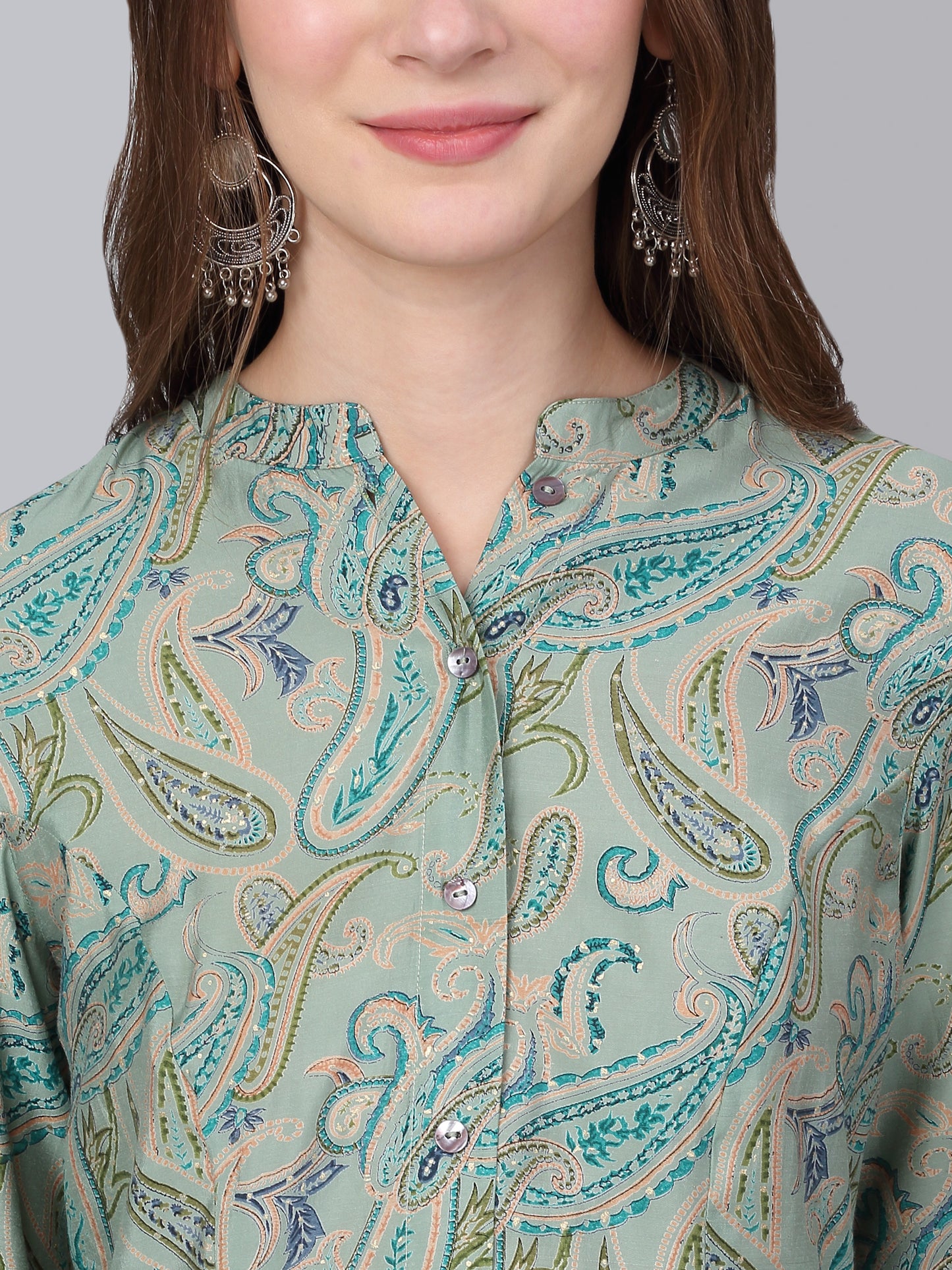 Women's Light-Green Solid Mandarin Collar 3/4th Sleeves...