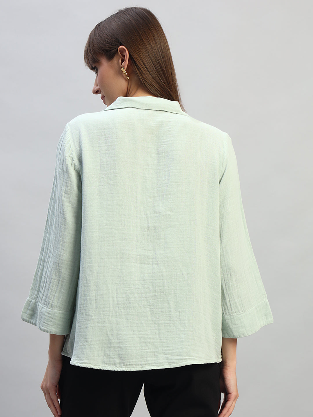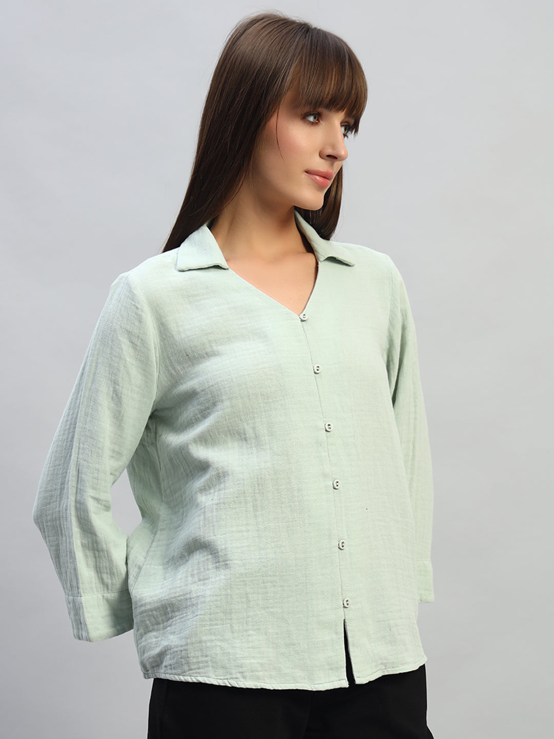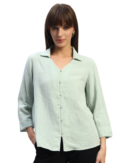 Women's Light Green Solid Full Sleeves V-Neck Casual Top