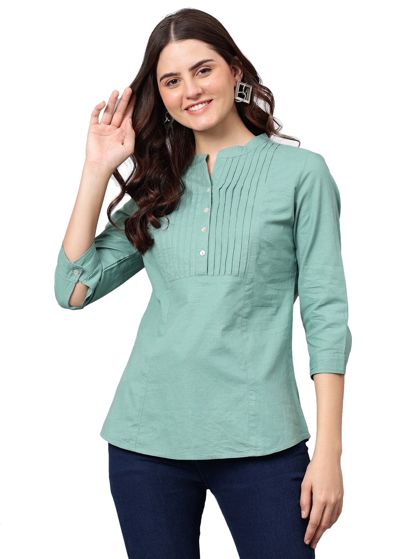 Women's Light-Green Solid Mandarin Collar 3/4th Sleeves Casual Tunic