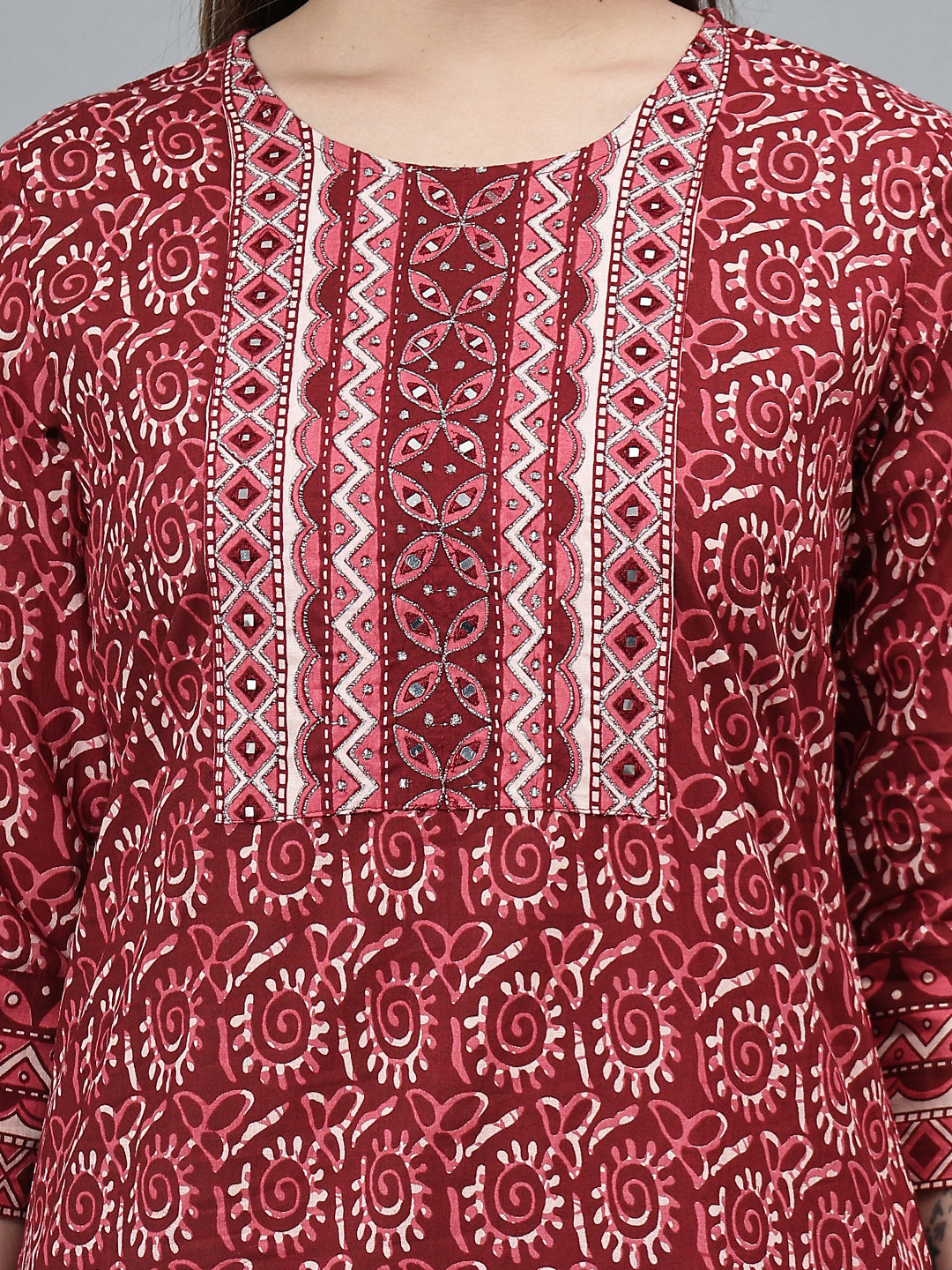 - Maroon printed calf-length kurta, has a round neck, three-quarter sleeves and side slits.