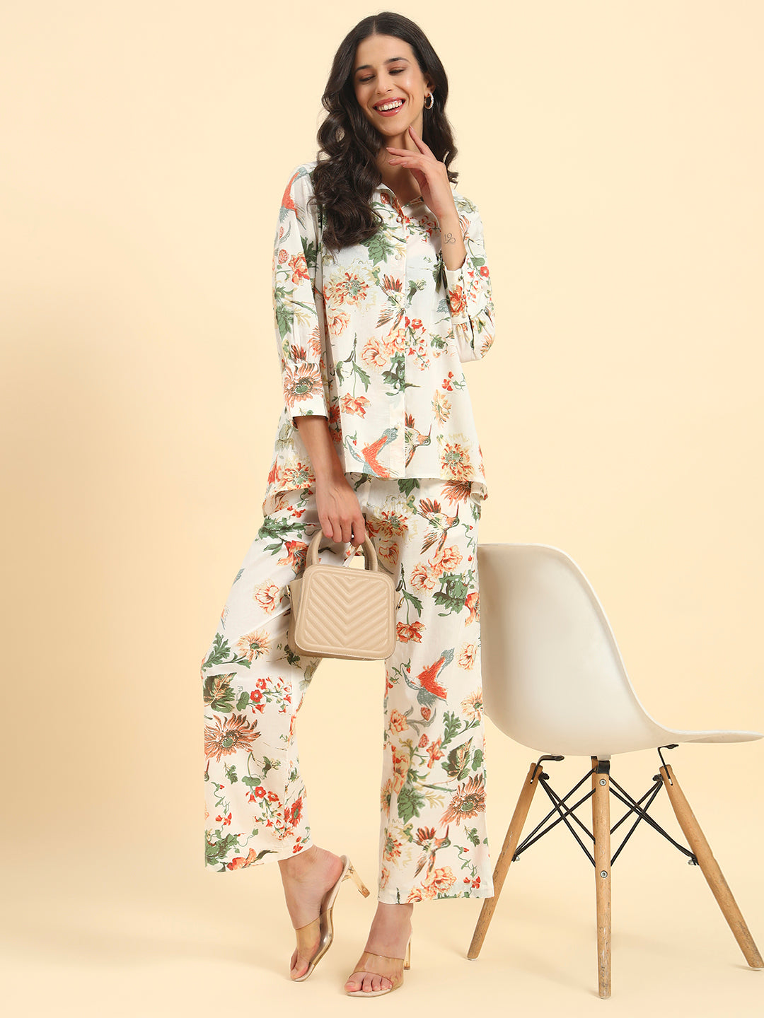 Women's Off White Printed 3/4th Sleeve Shirt Collar Co Ord Set