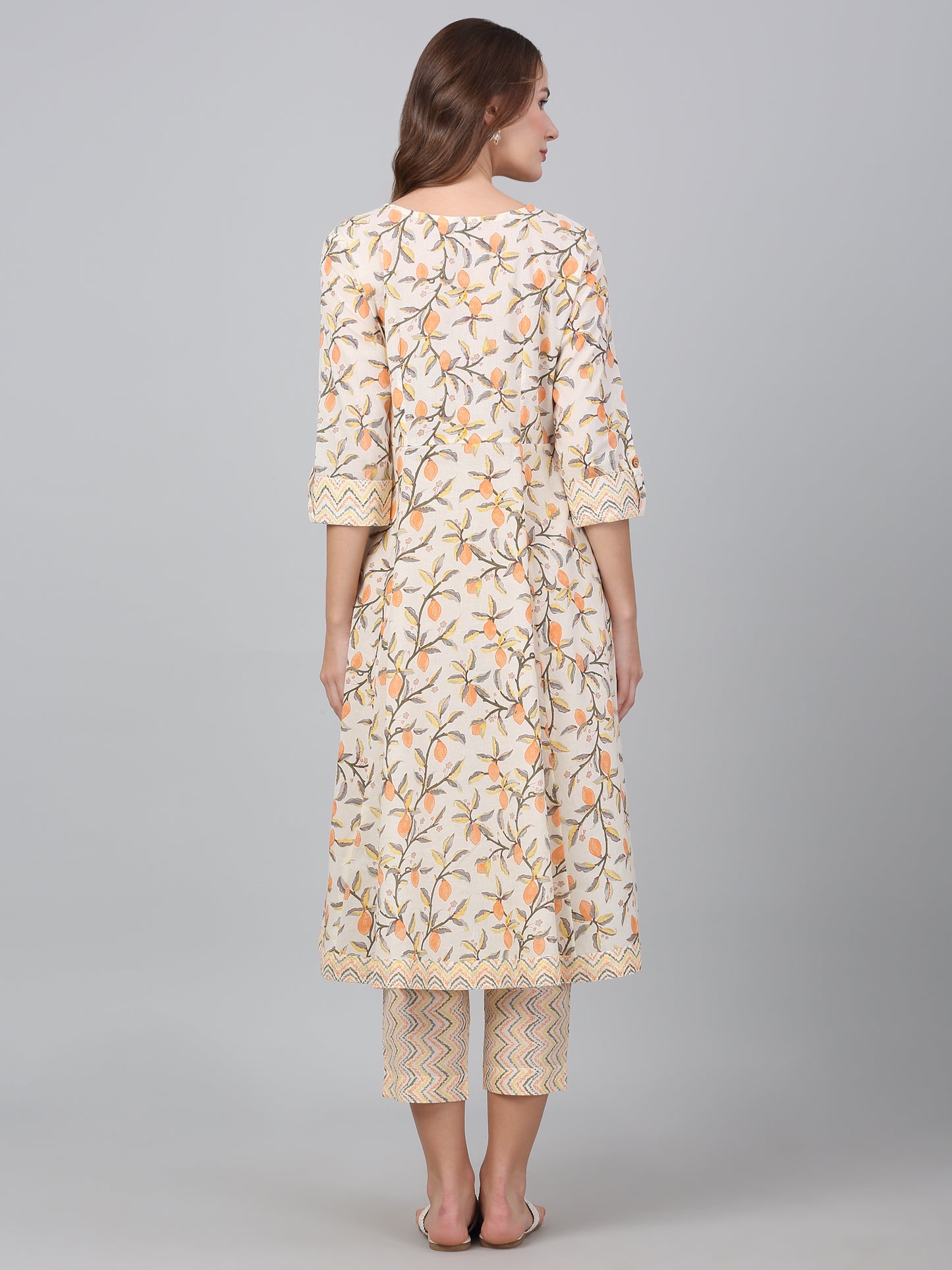 - Off White printed calf-length kurta, has a V-neck, three-quarter sleeves and side slits.