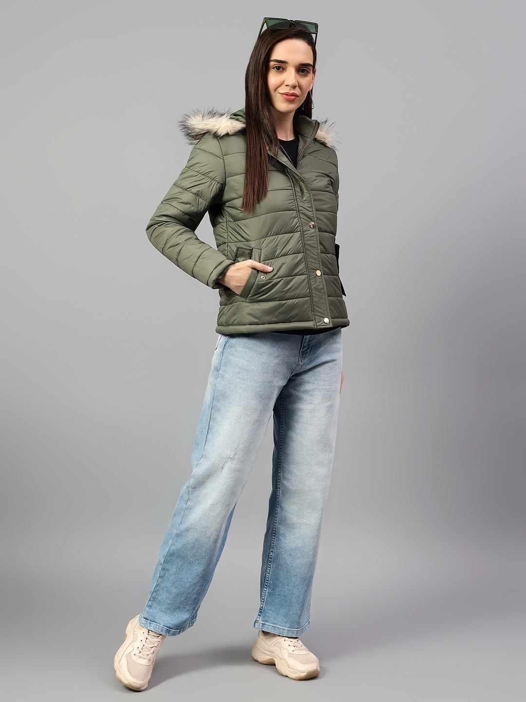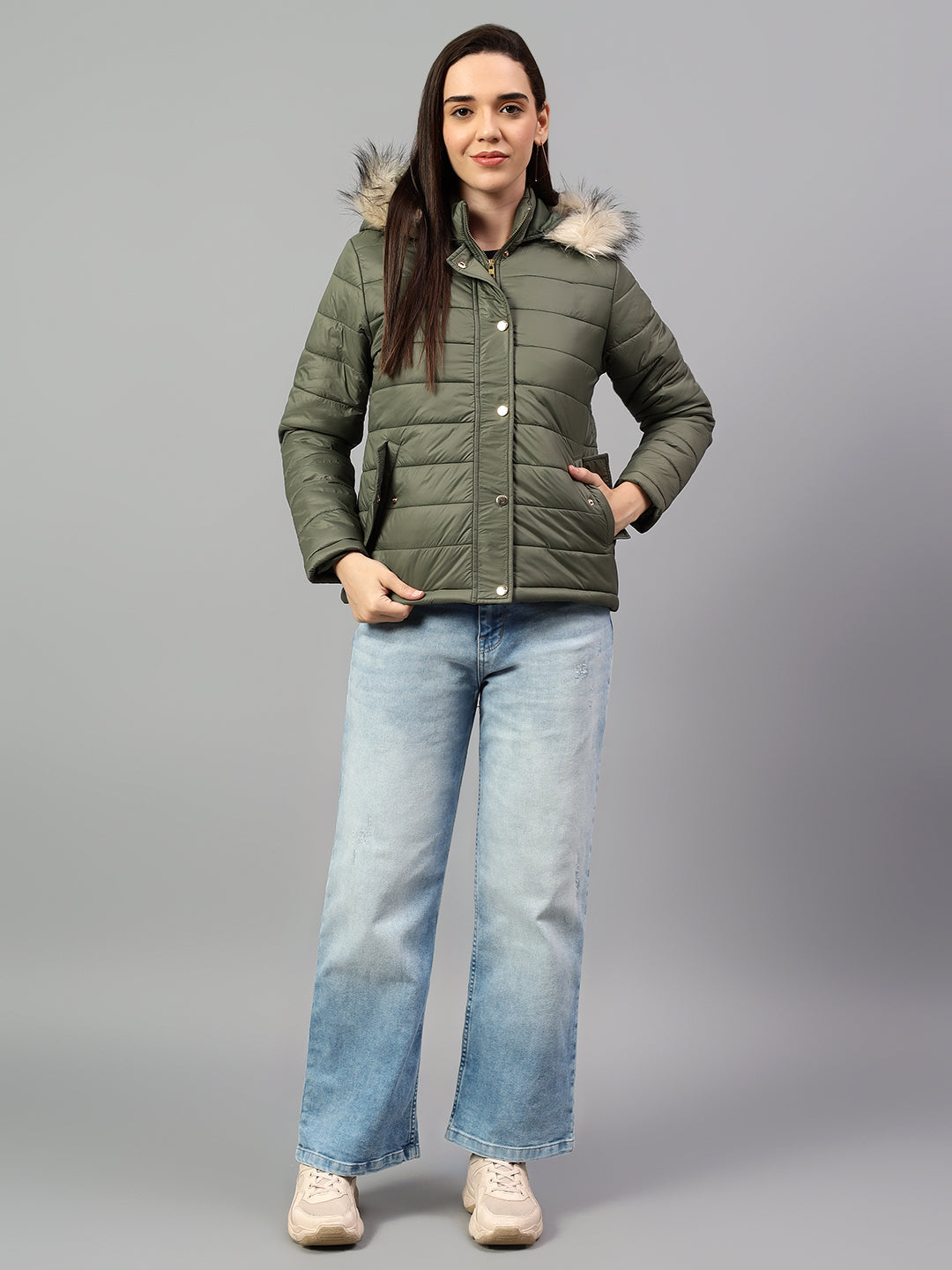 Women's Olive Green Solid Full Sleeves Winter Jacket