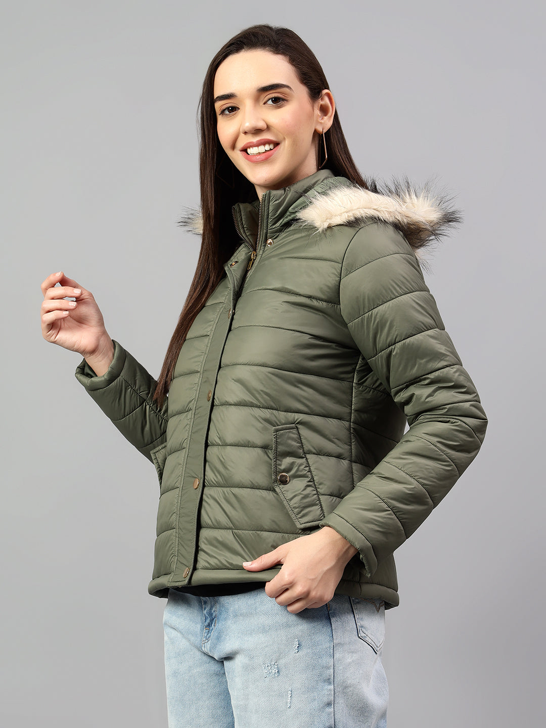 Flaunt your Winter Fashion game with our Olive Green color jacket. This jacket is made up of finest Nylon fabric which offer the perfect blend of style and warmth. Featuring a Standing collar, Quilted pattern, Trim Faux Fur Hood, full sleeves, Zipper closure with styled zipper pockets makes it perfect for office, travel or for a casual day which gives you all day comfort & fashion. Dry clean only.