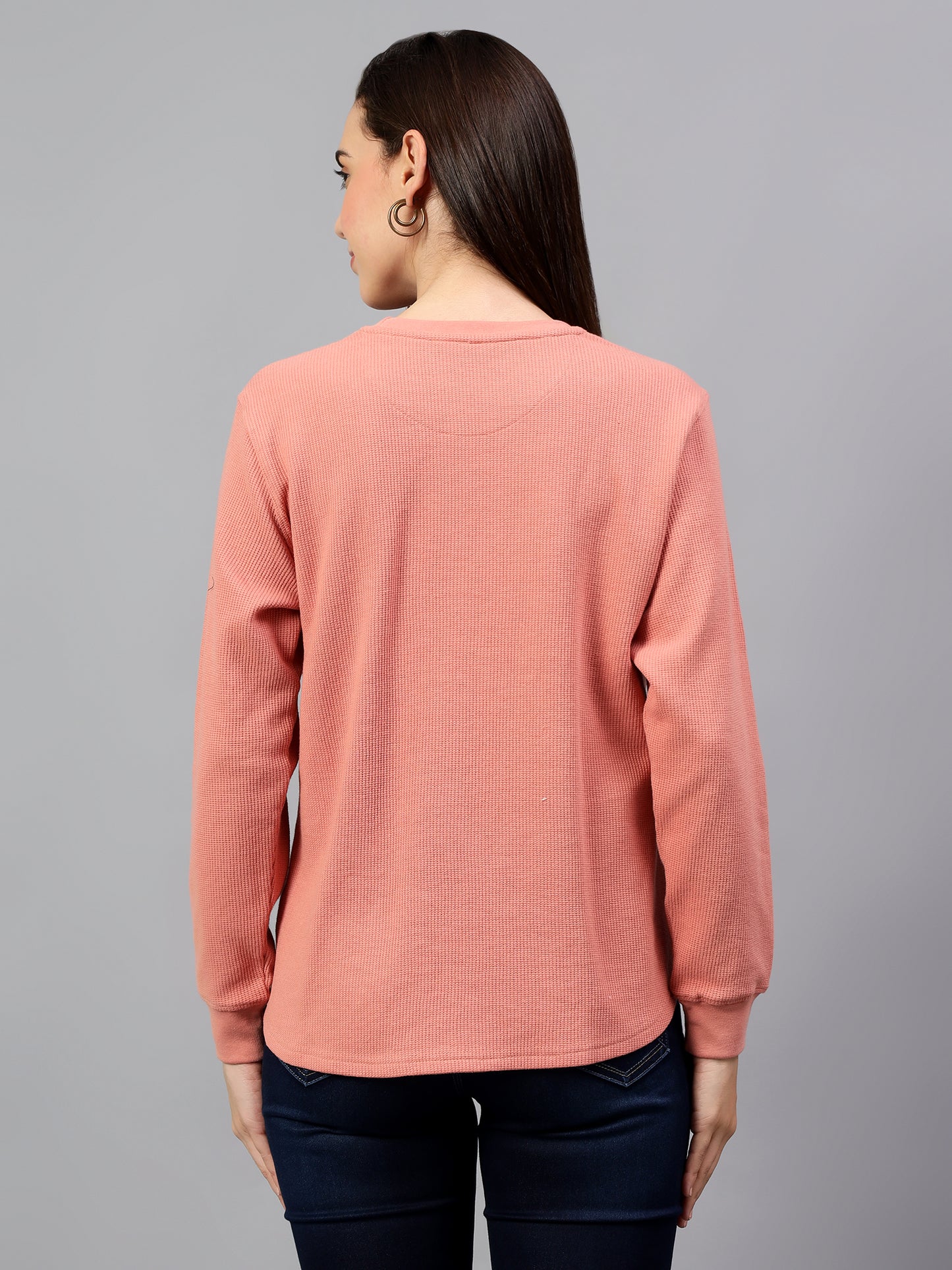 Women's Peach Self Design Round Neck Winter T-shirt