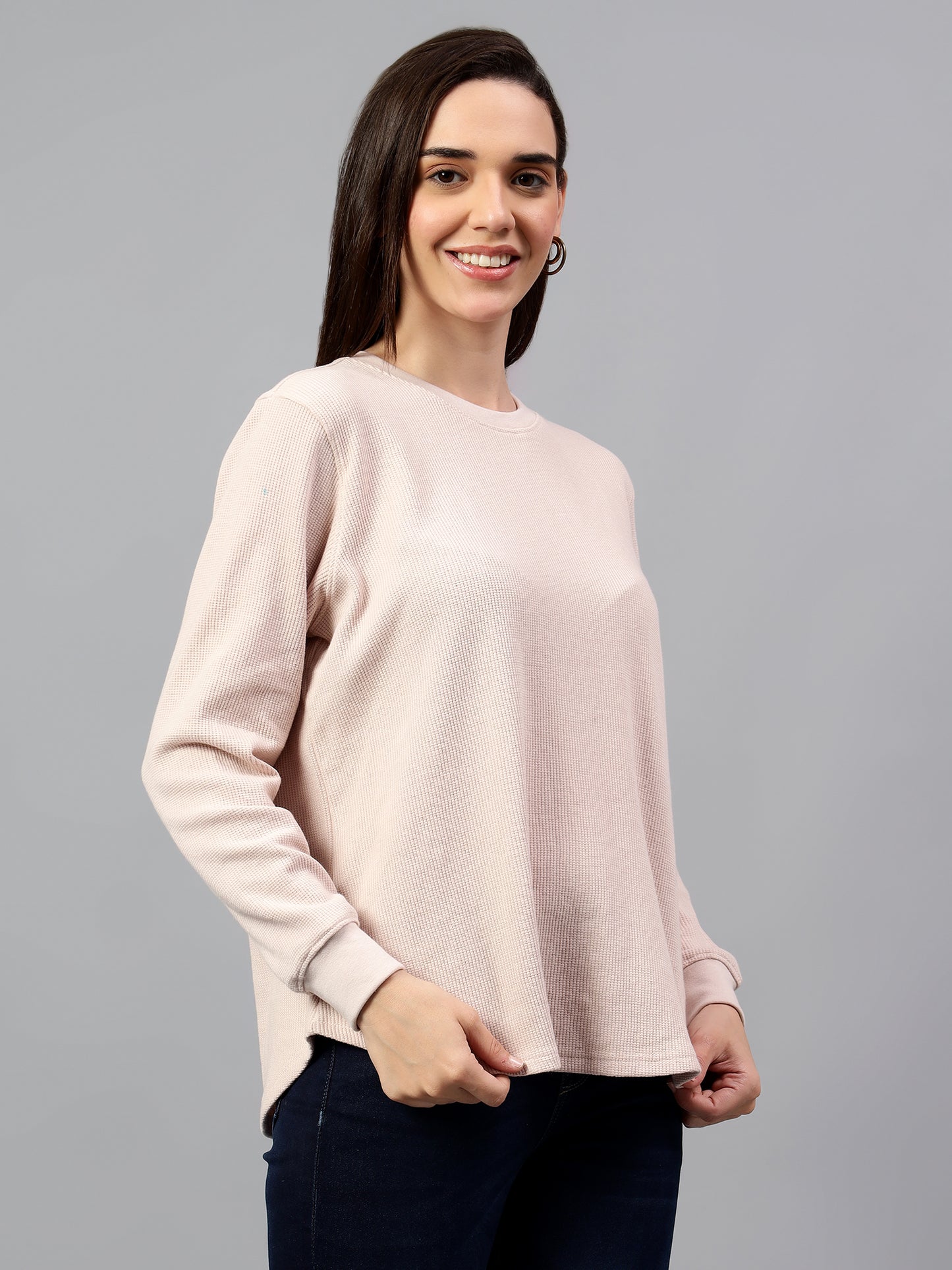 Women's Pink Self Design Round Neck Winter T-shirt