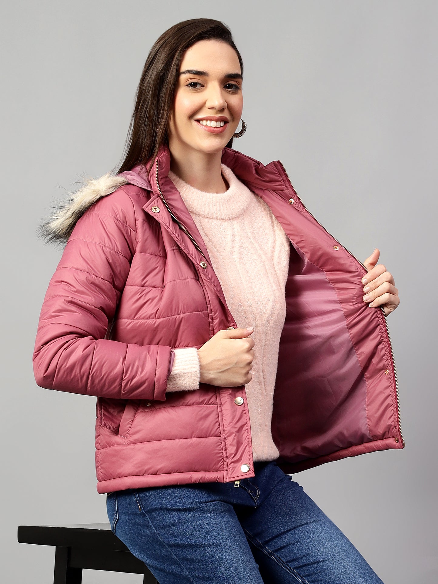 Enhance your Winter Fashion game with our Pink color jacket. This jacket is made up of finest Nylon fabric which offer the perfect blend of style and warmth. Featuring a Standing collar, Quilted pattern, Trim Faux Fur Hood, full sleeves, Zipper closure with styled zipper pockets makes it perfect for office, travel or for a casual day which gives you all day comfort & fashion. Dry clean only. -