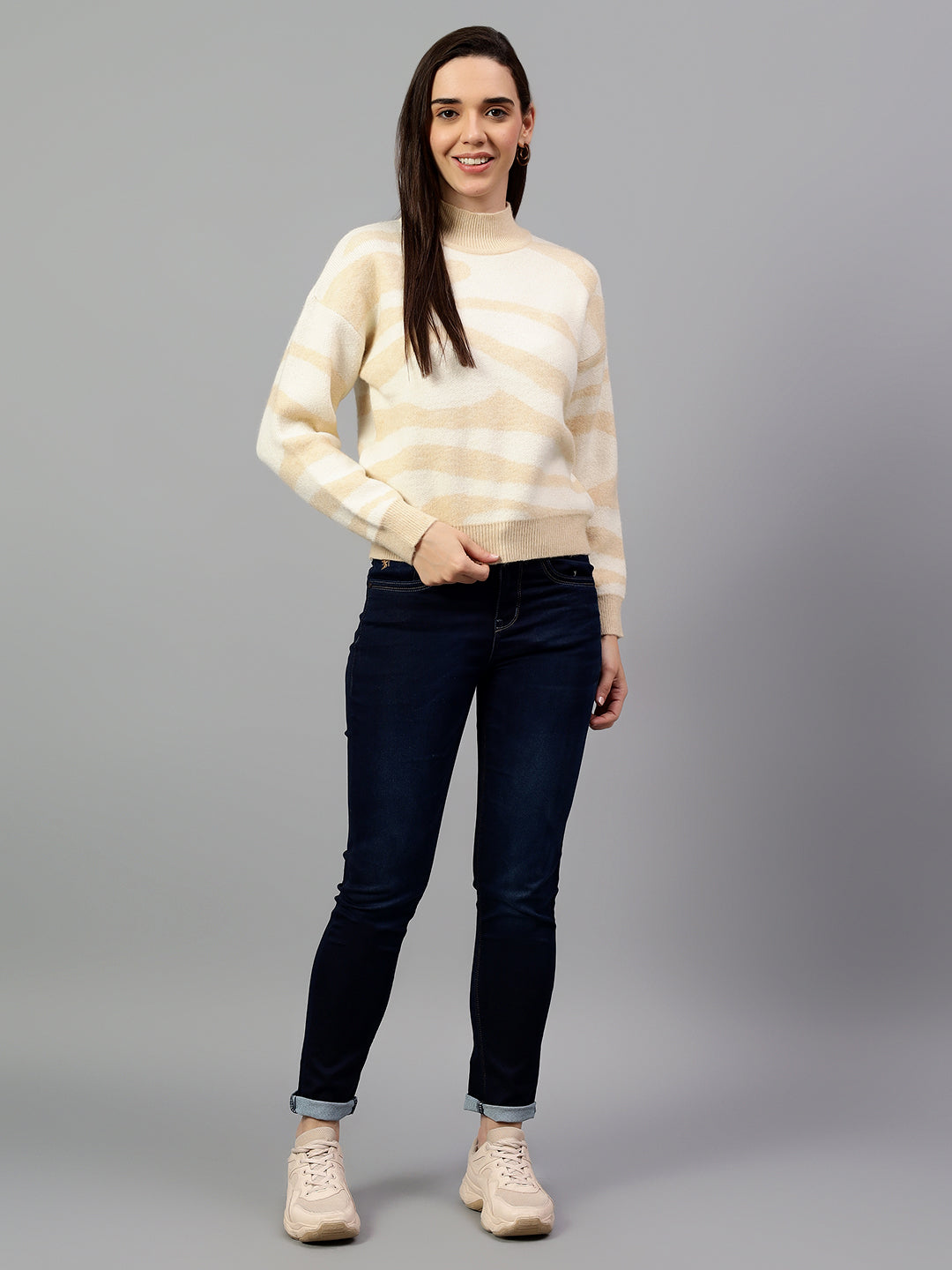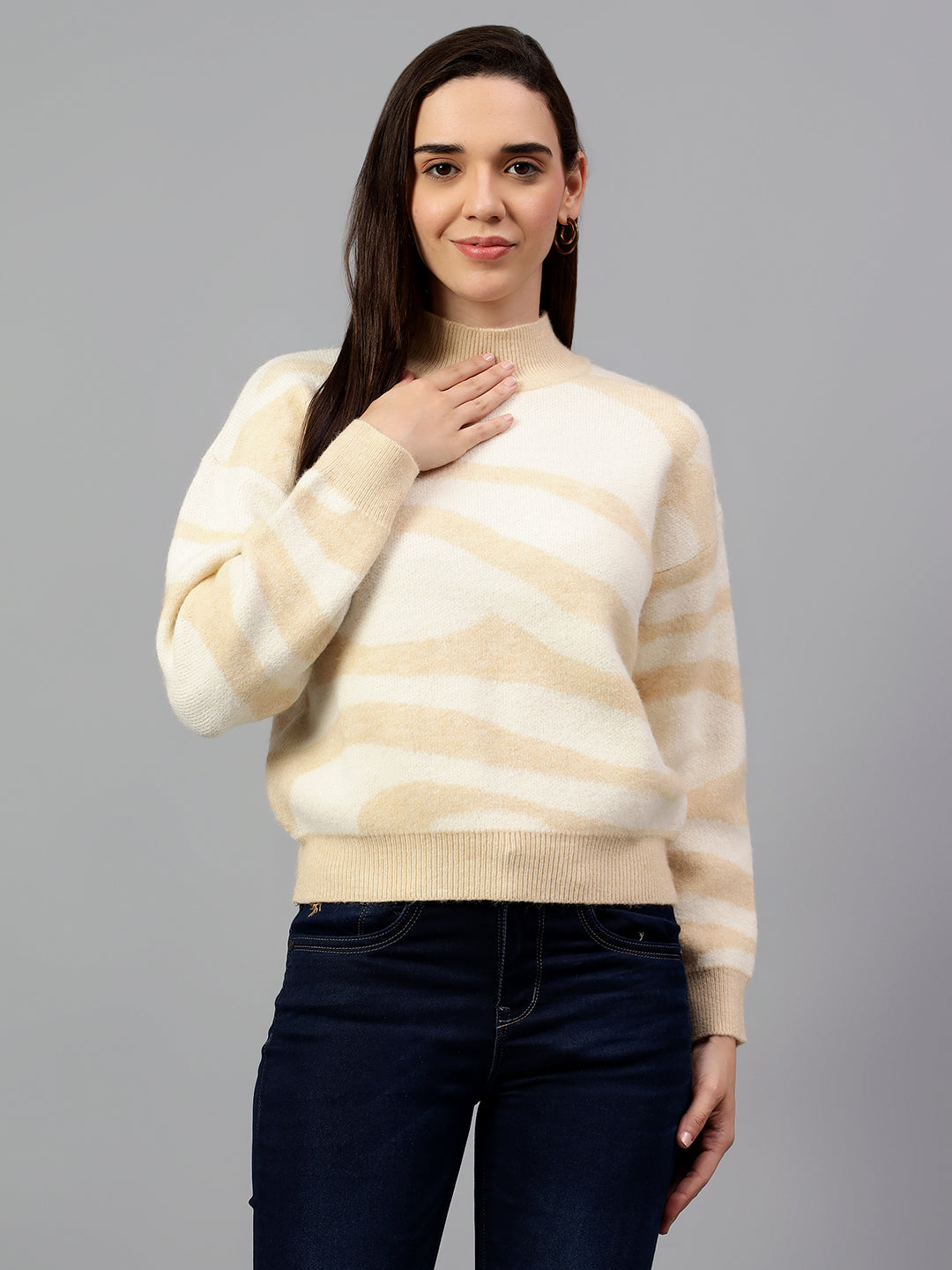 Women's Printed Beige Full Sleeve Casual Sweater