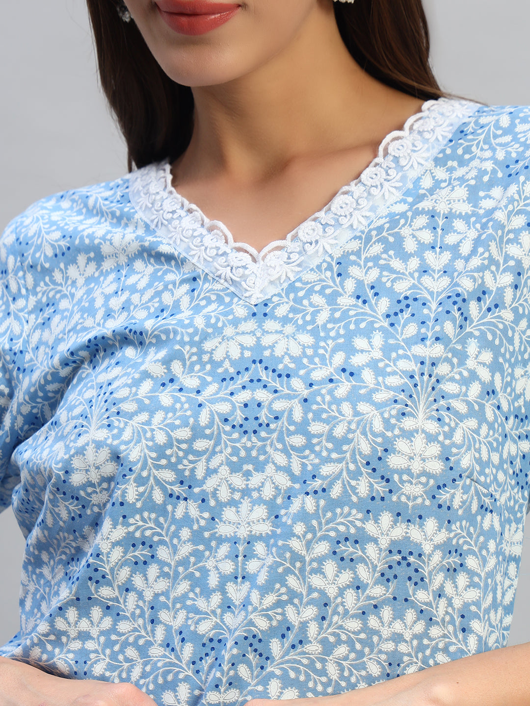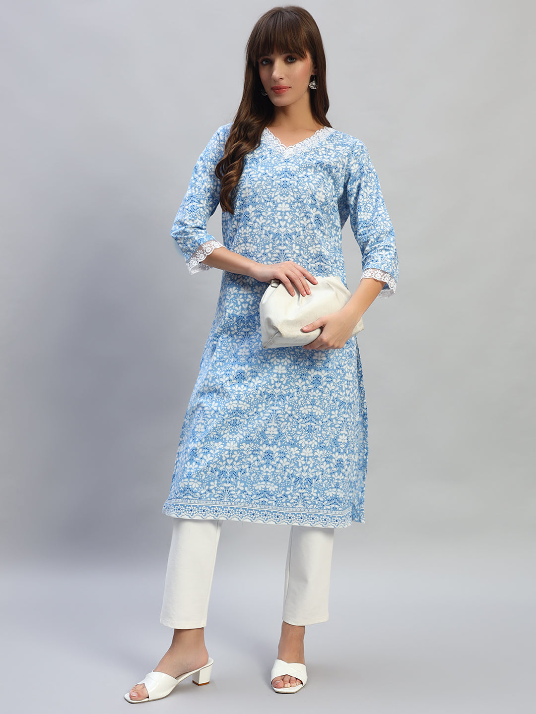 Women's Printed Blue V-Neck 3/4th Sleeves Casual Kurti