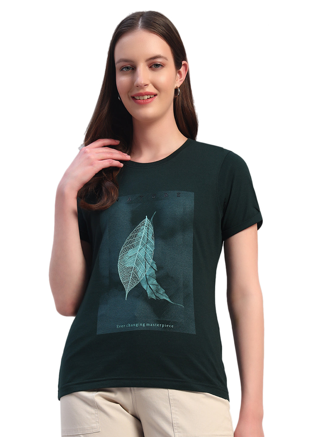 Women's Printed Bottle Green Round Neck Half Sleeves Casual T-Shirt